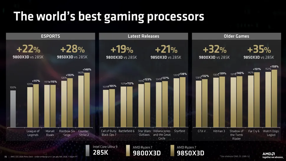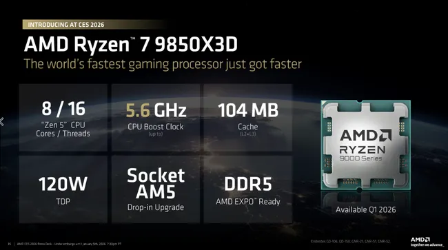 Najbolj opazen novinec v segmentu namiznih računalnikov je Ryzen 7 9850X3D, osvežena različica enega najbolj cenjenih gaming procesorjev v AMD-jevi ponudbi. Gre za 8-jedrni / 16-nitni čip s frekvenco do 5,6 GHz, kar je 400 MHz več kot pri predhodniku 9800X3D. To višje število ne pove bistveno več pri vsakdanjem delu, a se pozna v določenih igrah, ki so občutljive na hitrost procesorja (nekatere e-šport igre), kjer AMD napoveduje okoli 7-% izboljšavo zmogljivosti. V bolj zahtevnih AAA igrah je vpliv manj izrazit. Procesor obljublja konkurenčno prednost pred Intelovimi paradnimi modeli v več igrah, kot so Baldur’s Gate 3 in Counter-Strike 2. Novi Ryzen 7 9850X3D bo na tržišče prišel v prvem četrtletju 2026, AMD še ni razkril uradne maloprodajne cene.