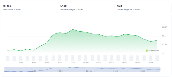 Trg se zdaj presenetljivo umirja. Skupna tržna kapitalizacija se znova dviguje nad 3 bilijone USD, Bitcoin pa po padcu z 126.000 USD stabilizira okoli 87.000 USD.