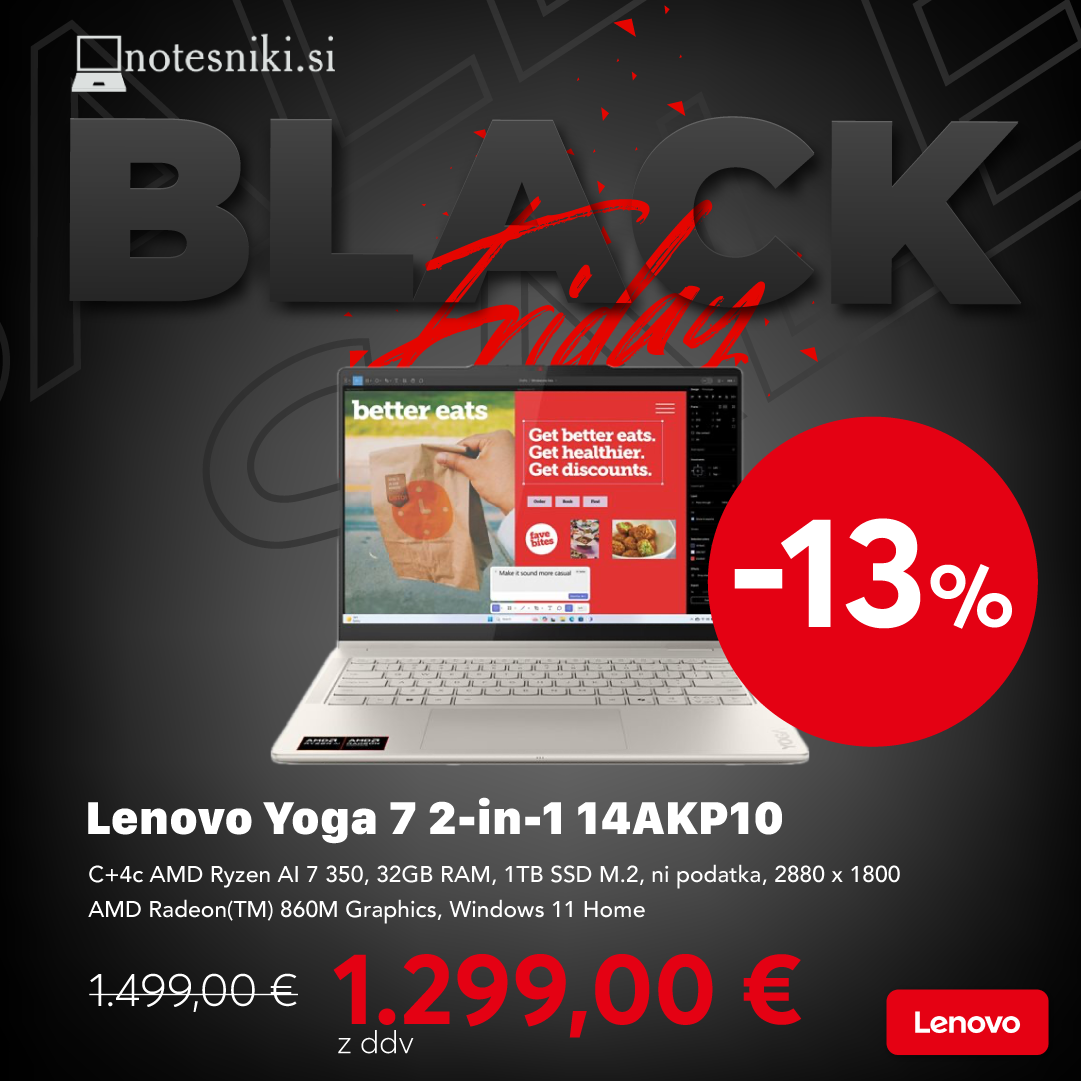Lenovo Yoga 7 2 in1 14AKP10 je aktualen model z najnovejšim AMD Ryzen procesorjem, ki podpira operacije umetne inteligence. Znižan je za 13% z 1499 EUR na 1299 EUR z DDV.