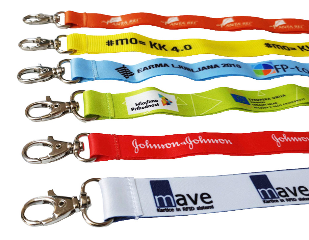 Naši potiskani ovratni trakovi so izdelani v Sloveniji, najmanjša količina je 50 kosov, običajni čas izdelave pa je približno en teden. Če je naročilo nujno, je rok lahko krajši, vedno pa imamo na zalogi tudi že izdelane enobarvne trakove s karabinom.