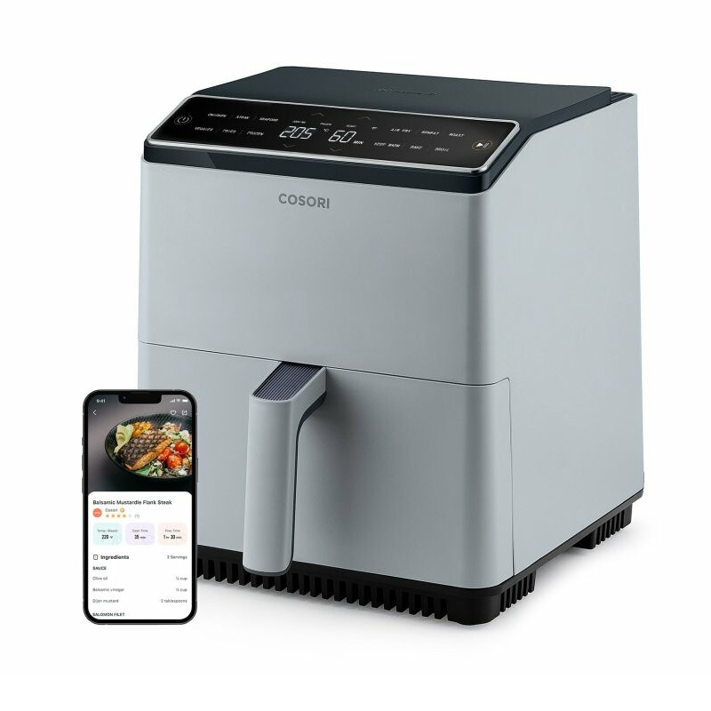 Zračni cvrtnik COSORI Dual Blaze Smart se ponaša z obsežnim košem s prostornino 6,4 litra v praktični kvadratni obliki, primeren tudi za večje družine. Z močjo 1700 W je naprava izjemno zmogljiva, kar skrajša čas kuhanja in prihrani energijo. Zaradi velikega notranjega prostora lahko pripravite celo 3,5 kg piščanca ali 17 piščančjih krilc, ki bi jih bilo težko vključiti v modele s krožnim košem ali prostornino 3–4 litra. Kljub prostornosti je naprava kompaktna in s svojim praktičnim kvadratnim dizajnom se prilega vsaki kuhinjski pult.