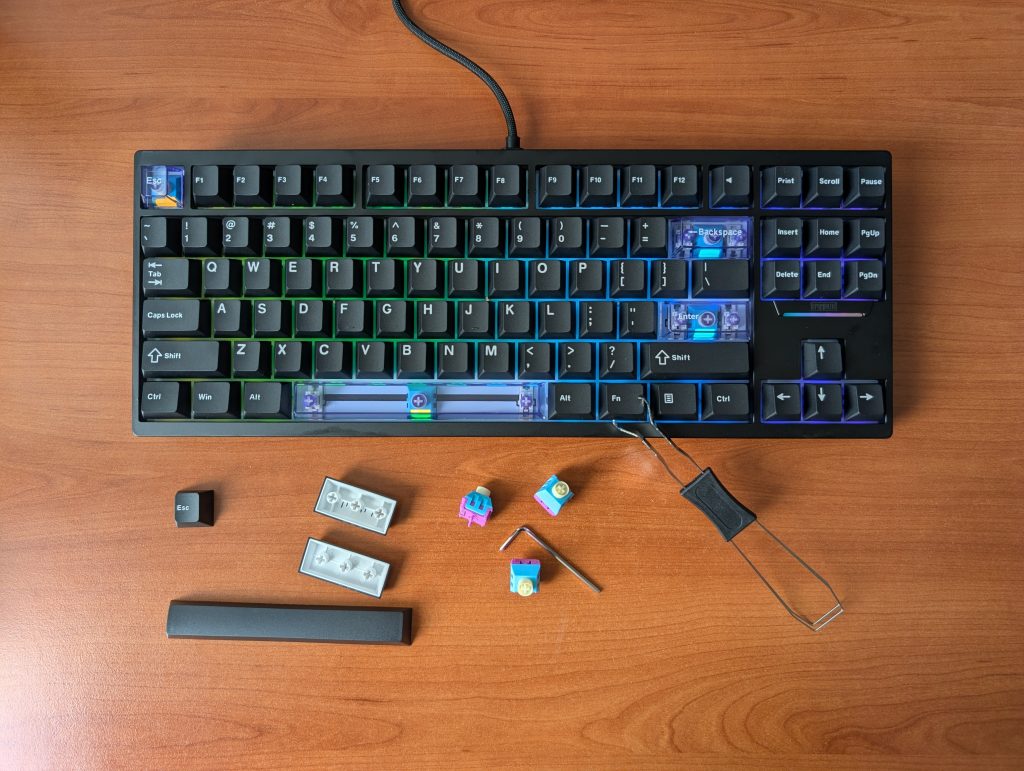 Epomaker priloži še nekaj dodatkov, kot so nadomestne tipke Escape, Space, Backspace in Enter – in sicer v črni barvi. Na tipkovnici so na začetku, kot smo že omenili, nameščene prozorne z rahlo vijoličnim odtenkom.
