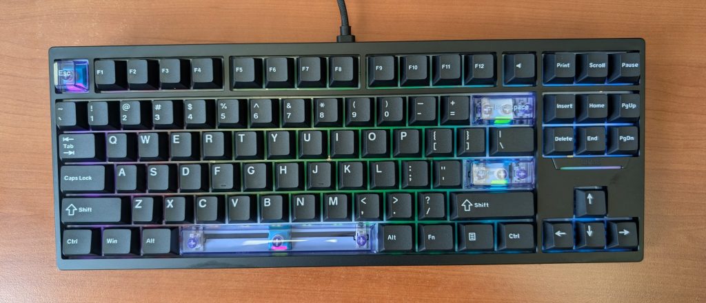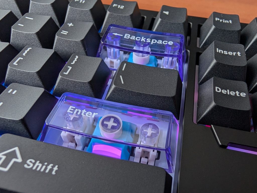 Kljub temu, da tipkovnici vlada črnina, nikakor ni pusta, saj je vseeno med tipkami dodanih nekaj prosojnih poudarkov v vijoličnem odtenku, ki dodajo kanček igrivosti. Prosojne so tipke Escape, Space, Backspace in Enter. Vseeno pa smo med našimi testiranji že videli tipkovnice, ki so dale veliko bolj jasno vedeti, da so gamerske.