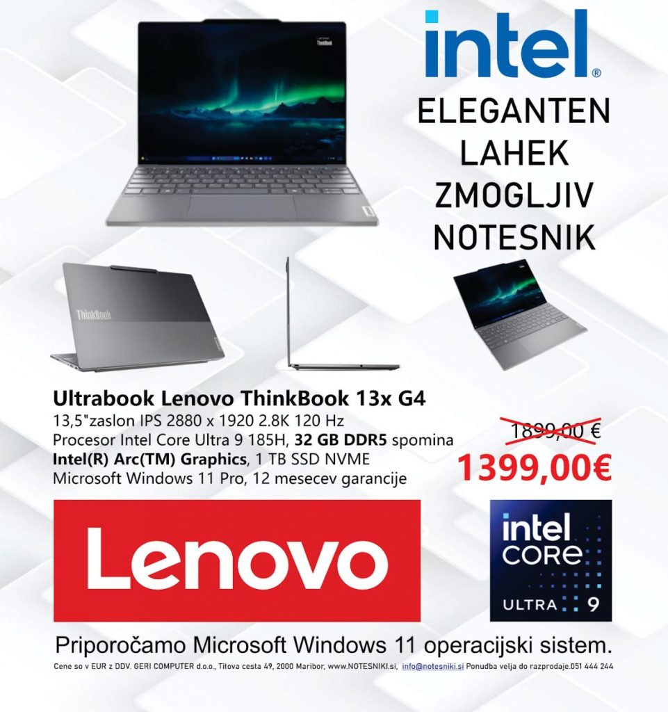Konfiguracija z Intel Core Ultra 9 185H, 32 GB DDR5 spomina, 512 GB SSD NVME diska in Microsoft Windows 11 PRO je na voljo z popustom 500 EUR. Maloprodajna cena 1899 EUR z DDV je za teh omenjenih 500 EUR znižana in sedaj pride pri www.NOTESNIKI.si omenjen Intel Ultrabook samo 1399 EUR z DDV.