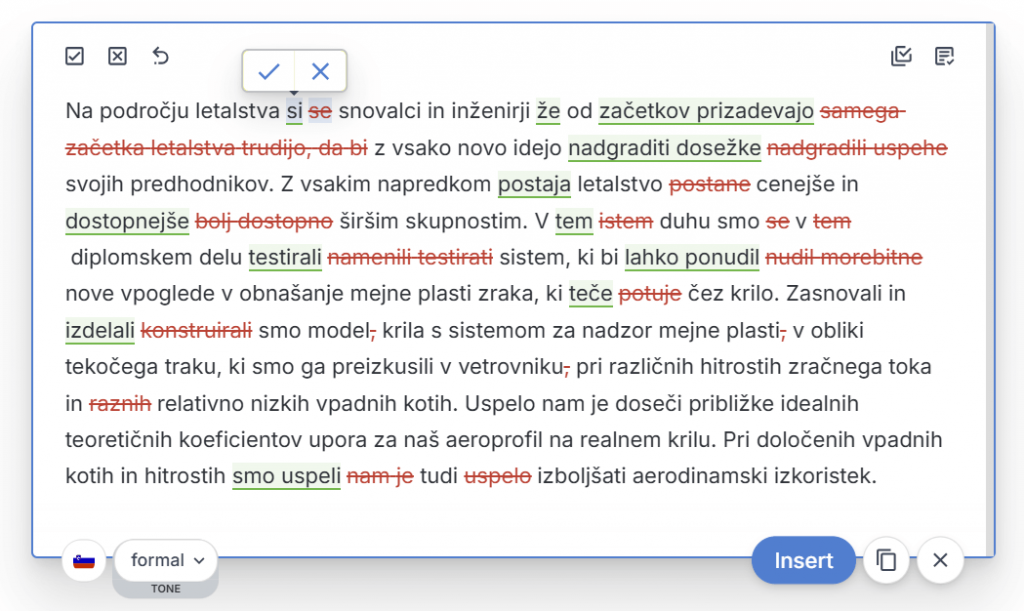 V urejevalniku izberete jezik, nato besedilo prilepite v okno, kliknete Improve text in opazujete čarovnijo. Predlogi izboljšav se prikažejo v desnem okencu. Vsako posamezno lahko sprejmete ali zavrnete, če menite, da popravki niso ustrezni. Končna različica besedila je bolj berljiva in daje bolj profesionalen vtis.