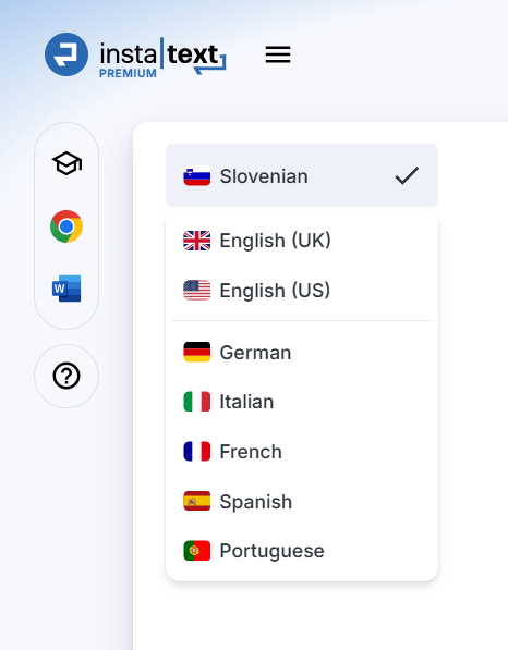 Privzeti jezik uporabnika se določi glede na državo ob registraciji. Če želite spremembo, lahko to uredite s podporo. Sicer pa lahko jezik med uporabo spreminjate levo zgoraj ob okencu za vnos besedila. Potrebujete le dva klika in že lahko uporabljate kateri koli jezik, ki ga InstaText omogoča.