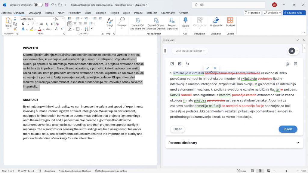 Pomembno je vedeti, da InstaText ni generator besedil. Besedil torej ne ustvarja, ampak je urejevalnik, ki z naprednimi jezikovnimi tehnologijami izboljšuje že napisano vsebino. To zagotavlja avtentičnost in izpolnjevanje zahtev glede avtorstva, kar je pomembno predvsem pri objavah in akademskem pisanju.