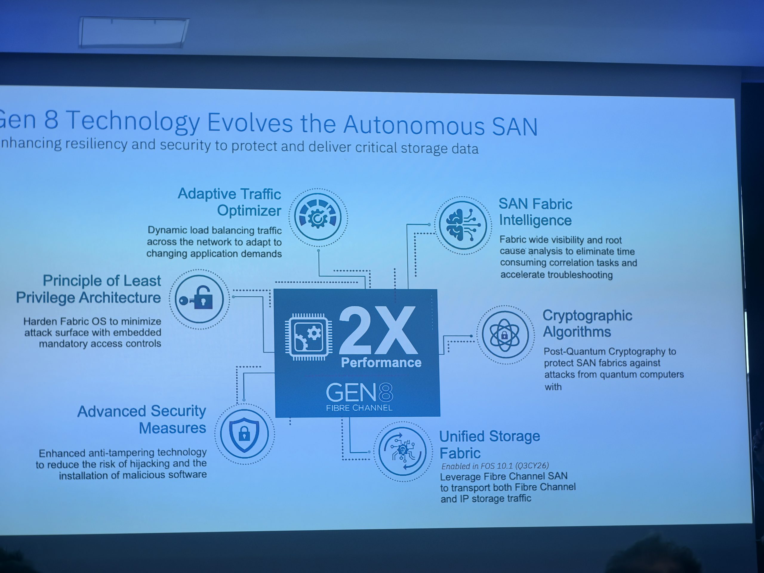 Zanimiva novost je Adaptive Traffic Optimizer, ki se s pomočjo učenja nenehno prilagaja prometu v omrežju in preprečuje ozka grla. Poleg tega nova generacija omrežne opreme omogoča dešifriranje in analizo dnevniških zapisov s pomočjo UI (SAN Fabric Intelligence), kar administratorjem pomaga hitro odkriti korenski vzrok težav v okolju.