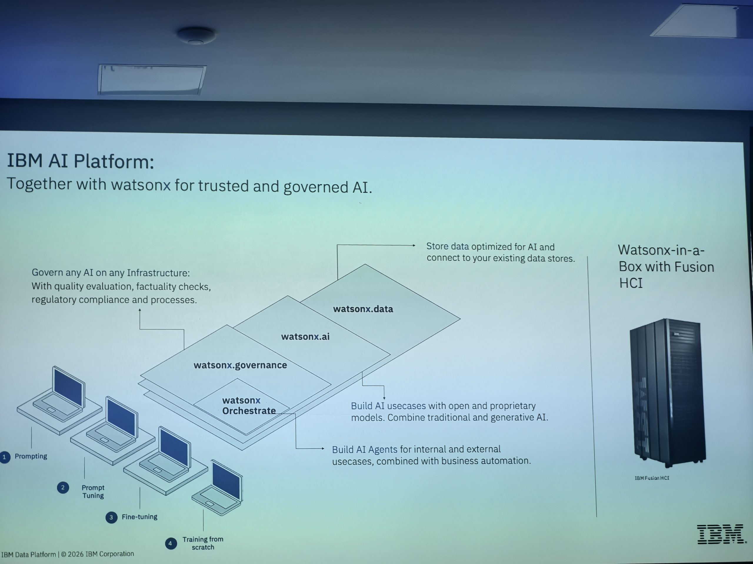 Platforma watsonx.ai in orchestrate omogočata podjetjem, da te agente gradijo, upravljajo in nadzorujejo. Ključni element tukaj je upravljanje podatkov (angl. Data Governance), saj brez zaupanja vrednih in pravilno klasificiranih podatkov UI projekti pogosto ne preidejo iz faze pilotnega preizkušanja v produkcijo.