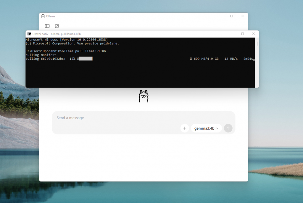 Ob prvem zagonu se model prenese na lokalni disk, kar lahko traja nekaj časa. Če bi želeli na primer naložiti model llama3, vpišite: