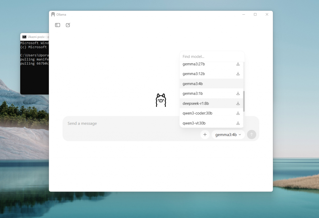 Če ste na Windowsu ali Macu, si lahko prenesete namestitveno datoteko, po namestitvi boste program uporabljali preko pogovornega okna. Ollama vam takoj omogoča, da iz spustnega menija sami izberete (in prenesete) željeni jezikovni model (GPT, Minimax, Qwen, DeepSeek …), lahko pa tudi sami dodate nove modele, vendar s pomočjo ukaznega poziva.