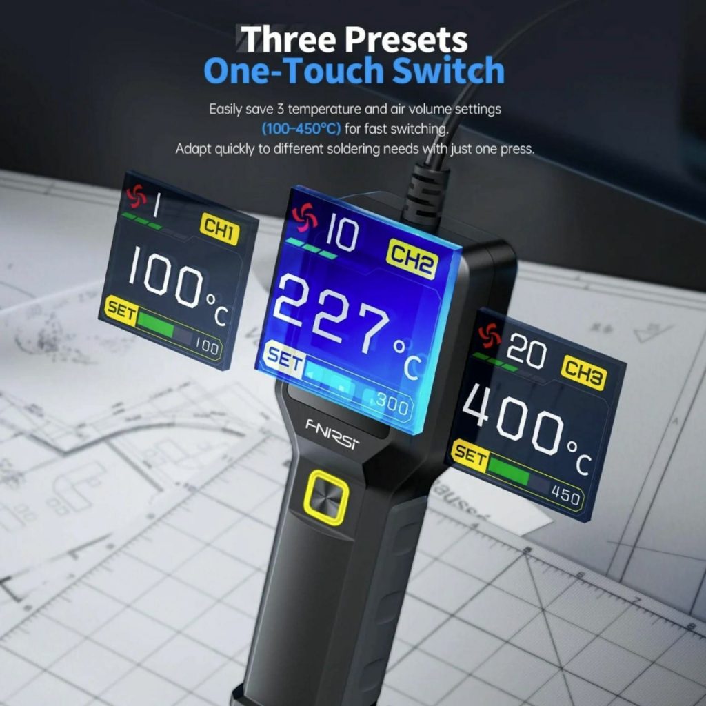 Spajkanje in odspajkanje komponent na sodobnih večplastnih vezjih zahtevata skoraj kirurško natančnost, kjer lahko vsaka stopinja preveč pomeni uničenje dragocenega čipa. Pametna pištola na vroč zrak FNIRSI SAG-55 Plus v to opravilo prinaša stopnjo inteligence, ki je v tem cenovnem razredu prej nismo poznali. Namesto nerodnih postaj z debelimi cevmi ima uporabnik v roki kompaktno napravo, ki se segreje v nekaj sekundah in vzdržuje temperaturo s stabilnostjo, ki navduši še tako zahtevnega mojstra. Ko se vroč zrak usmeri na majhen SMD upor ali integrirano vezje, vgrajeni senzorji nenehno prilagajajo moč grelca, da ne pride do toplotnega udara. Delo s to pištolo postane tekoče, skoraj meditativno.