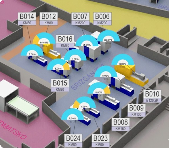 Digitalni dvojček strojnega parka s prikazom trenutnega  delovanja (OEE + stanje oz. morebitni zastoji + trenutni števec + koliko je še do konca).
