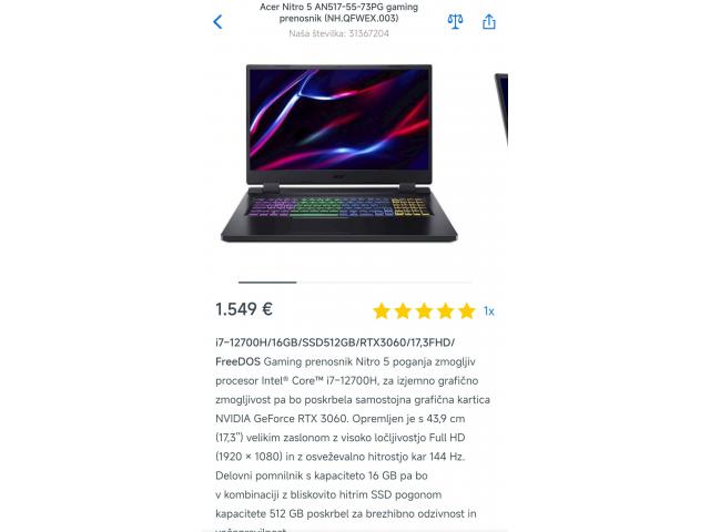 Prodam popolnoma nov računalnik z računom kupljen v tujini. Dodatno ima naložene licenčne office ter antivirusni program. Za bonus naložim dve igre od iger GTA V, Red Dead Redemtion 2, Call of duty, Fifa, Forza Horizon, Assasin creed ... AMD Ryzen 5 7535HS/16GB RAM/512GB SSD/RTX 4050/RGB tipkovnica/144Hz monitor, Model Name: FA607NU-BS53-CB Operating System:...