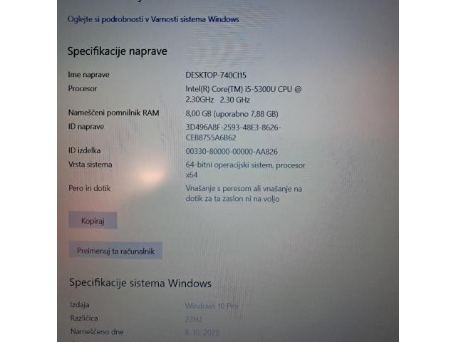 Na prodaj je prenosni računalnik HP EliteBook 850 G2, ki je v izjemno lepem stanju in brezhibno deluje. Ta poslovni prenosnik je idealen za profesionalce, ki iščejo zanesljivost in zmogljivost. S procesorjem Intel Core i5 5300U, 8 GB RAM in 256 GB SSD diskom zagotavlja hitro in učinkovito obdelavo podatkov. 15.6" zaslon z ločljivostjo 1920 x 1080 prinaša jasne in ostre slike, medtem ko osvetljena tipkovnica omogoča udobno tipkanje tudi v slabo osvetljenih prostorih.