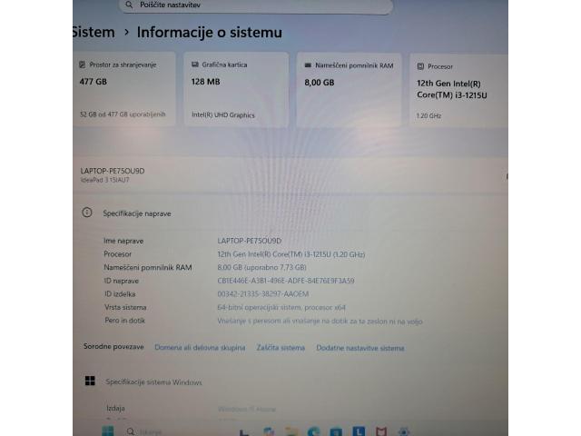 Na prodaj je prenosni računalnik Lenovo IdeaPad 3 15IAU7, ki je bil zelo malo v uporabi in je brezhibno delujoč, kot nov. Opremljen je s 15.6″ Full HD zaslonom (1920 x 1080) ter zmogljivim procesorjem Intel Core i3 (12. generacija) 1215U, ki deluje pri hitrosti do 4.4 GHz. Ima 8 GB DDR4 RAM in 256 GB SSD, kar zagotavlja hitro delovanje in dovolj prostora za shranjevanje. Računalnik tehta le 1.63 kg, kar omogoča enostavno prenašanje.
