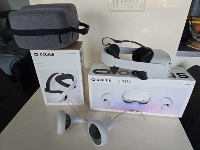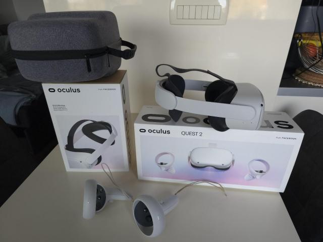 Prodajam rabljeni Oculus Quest 2 VR sistem z dodatnim Elite trakom za udobnejšo uporabo in praktično torbo za shranjevanje. Komplet je v dobrem stanju in vključuje vse originalne komponente, ki so vidne na sliki. Popoln paket za vse, ki si želijo kakovostno VR izkušnjo z dodatki za večje udobje.