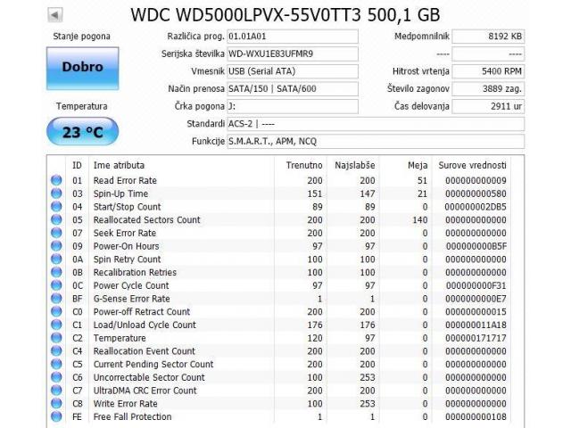Prodam zunanji HDD disk WD Elements s kapaciteto 1TB. Disk je v odličnem stanju, vsi podatki o zmogljivosti so razvidni iz priloženega screenshot-a CrystalDiskInfo. Povezava na računalnik možna tudi preko usb 3.0. Za dodatne informacije mi pišite SMS na 069 759 947. Lp, Nikola!