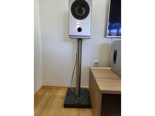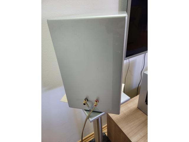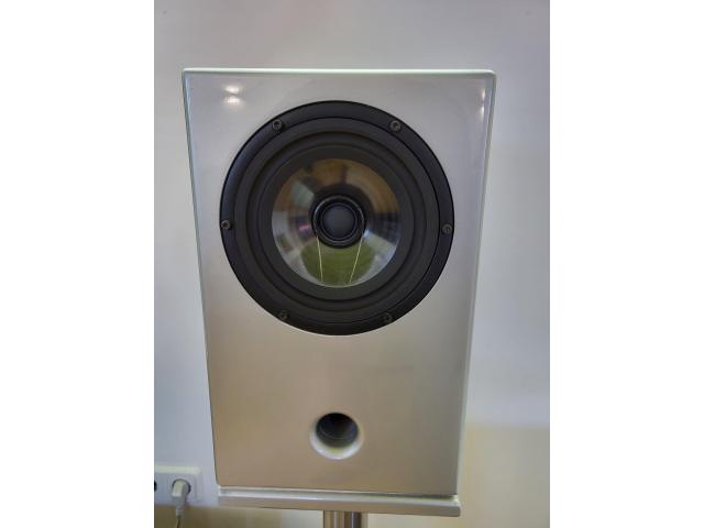 Ohišja so lesena, profesionalno lakirana v metalik srebrni barvi. Zraven dveh sprednjih zvočnikov sta tudi stojala: spodnji del iz črnega granita, cev je brušen inox, zgornja plošča je lesena, barvana v isti barvi kot zvočniki. Nekateri zvočniki (2 kos) imajo praske, nastale pri selitvi. Zato je cena znižana in je lahko komplet tudi projekt, ki bi ga...