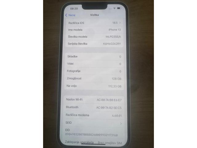 Prodam telefon Apple iPhone 13 Mini, 128GB, modre barve. Brezhibno delujoč in dobro ohranjen. Na ohišju minimalne sledi uporabe (glej slike). Priložim originalno embalažo in polnilni kabel. Prevzem v Postojni ali Ljubljani. Več informacij: https://m.gsmarena.com/apple_iphone_13_mini-11104.php