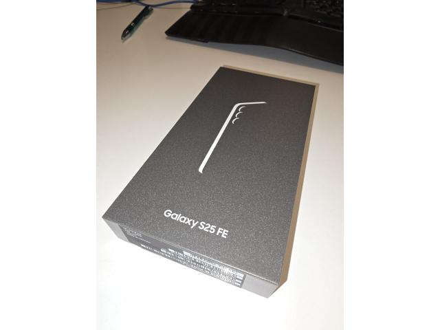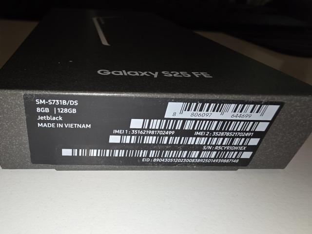 Nov, zapakiran, še neodprt telefon Samsung Galaxy S25 FE, črn, 128 GB prostora, 8GB Rama. Dve SIM kartici. Stereo zvok. Podpora za slušni aparat.