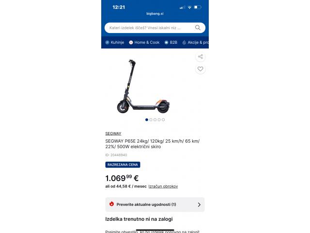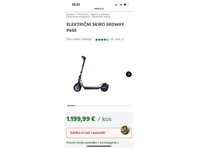 Naprodaj električni skiro Segway – City Cruiser (P-serija). • odprta embalaža • originalna škatla • zelo lepo ohranjen • zmogljiv in kakovosten skiro višjega razreda Primeren za mestno uporabo in daljše razdalje. Ogled možen po dogovoru v Kranju. Prevzem v Kranju/Ljubljani. Možno pošiljanje!