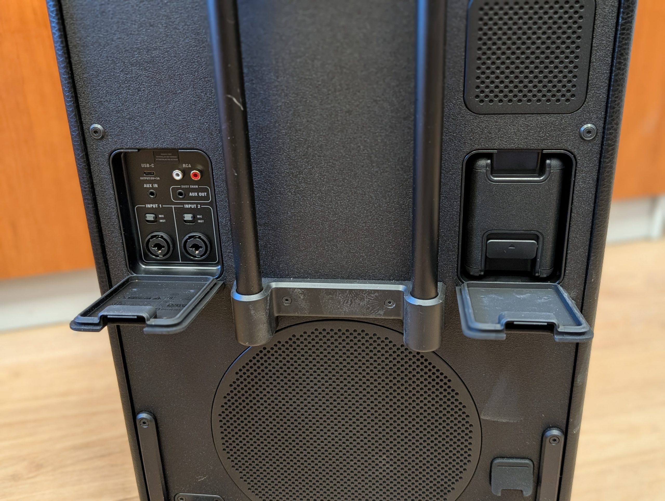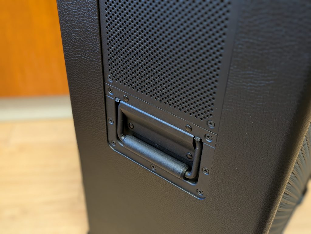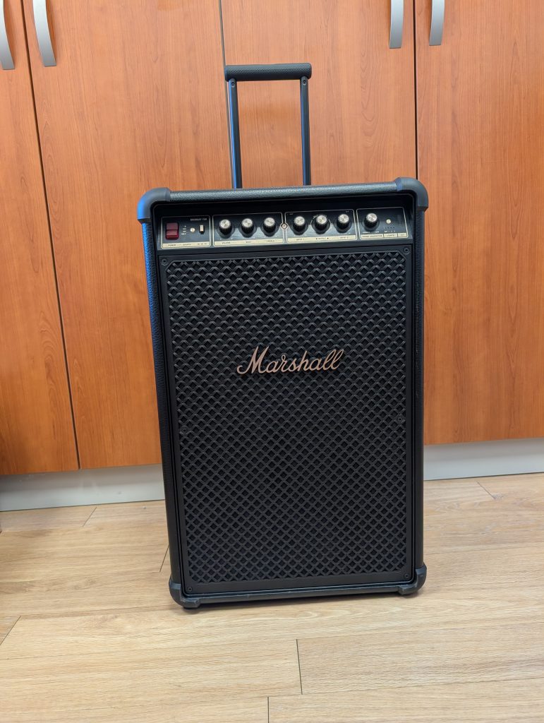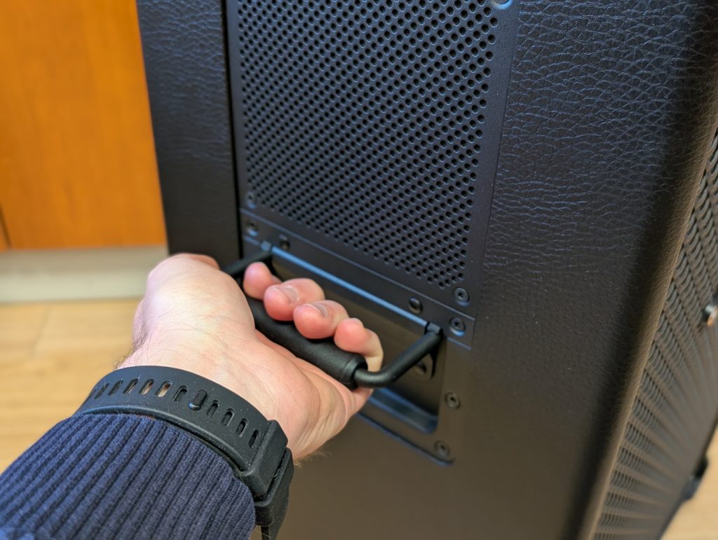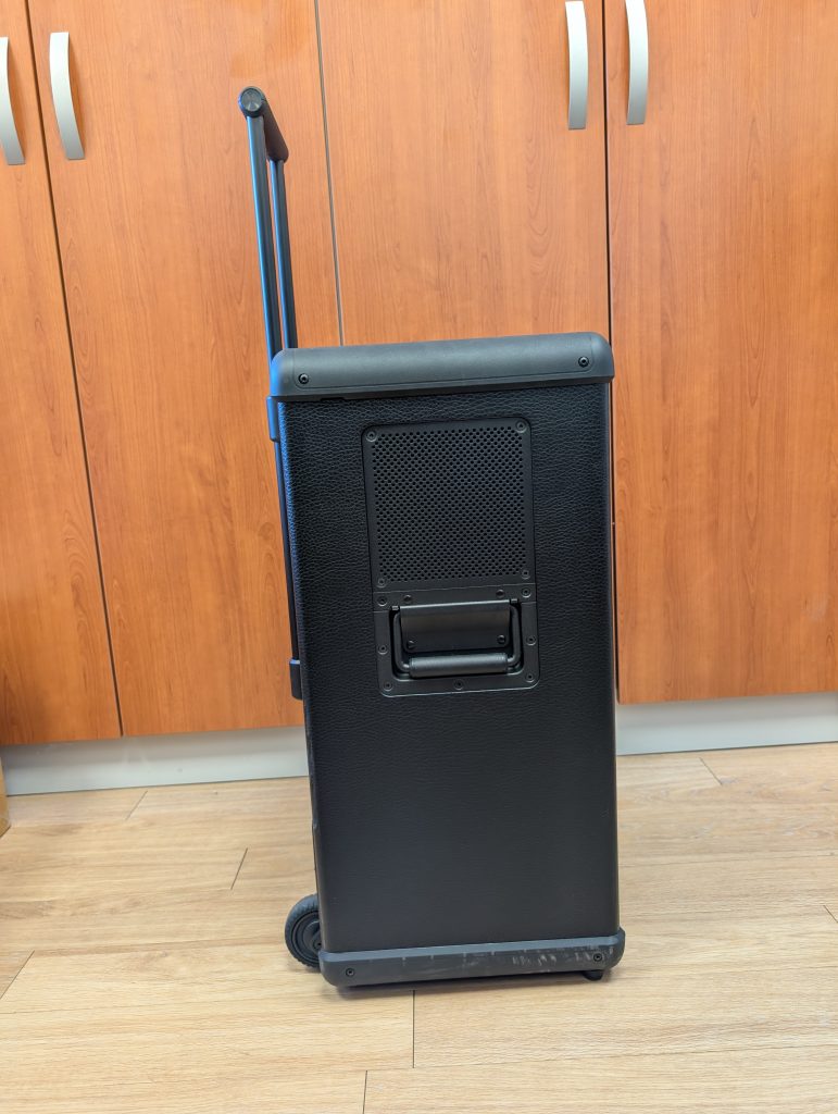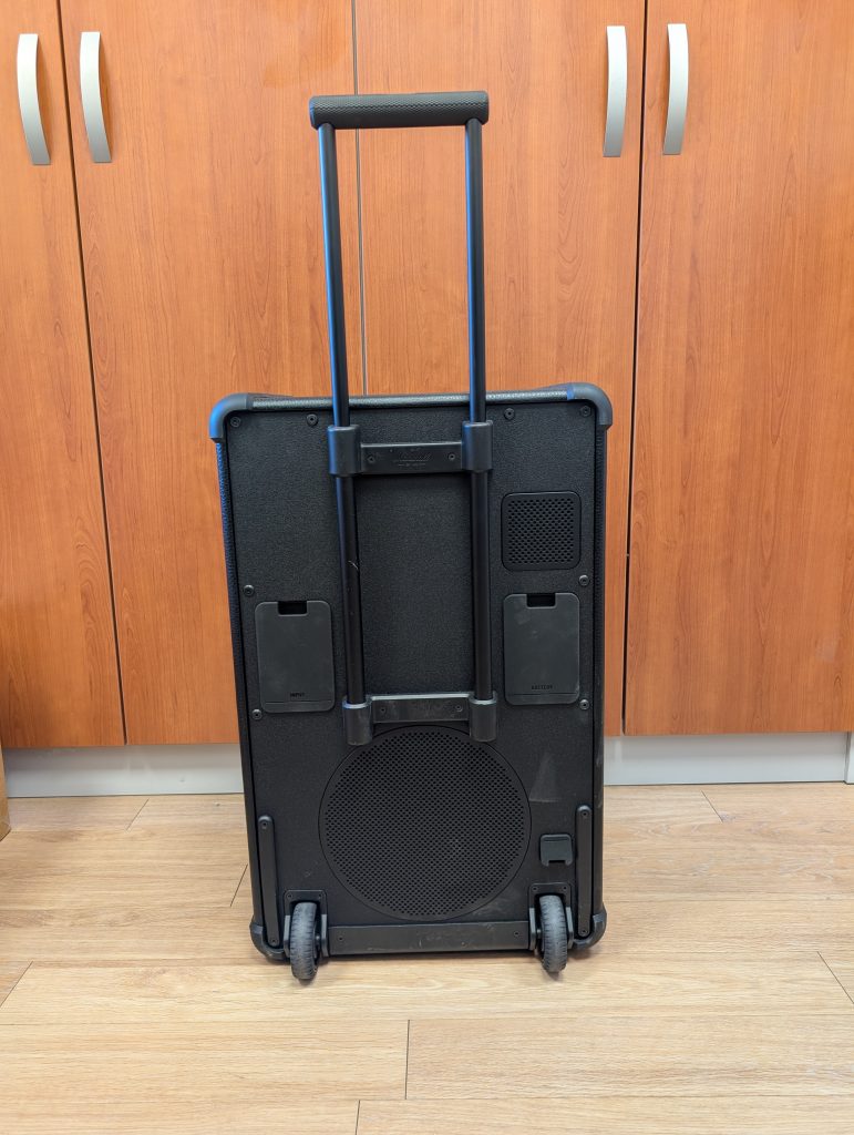 Glede velikosti (413 x 652 x 355 mm) lahko rečem, da to ni zvočnik, ki ga postaviš na polico, kljub temu pa sem testiral tudi večje zvočnike v tem razredu, tako da Marshall ohranja kompaktnost. Sicer gre za pravo zvočno postajo, ki pa ostaja prenosljiva. K temu največ pripomorejo kolesa in izvlečni ročaj, podoben kot pri večjem kovčku. Na ta način lahko Marshall Bromley 750 brez težav premikaš po stanovanju ali dvorišču. Ko ga je treba dvigniti, je to manjši projekt, saj je težak 23,9 kg, ampak tudi na to je proizvajalec pomislil in vgradil stranska ročaja.