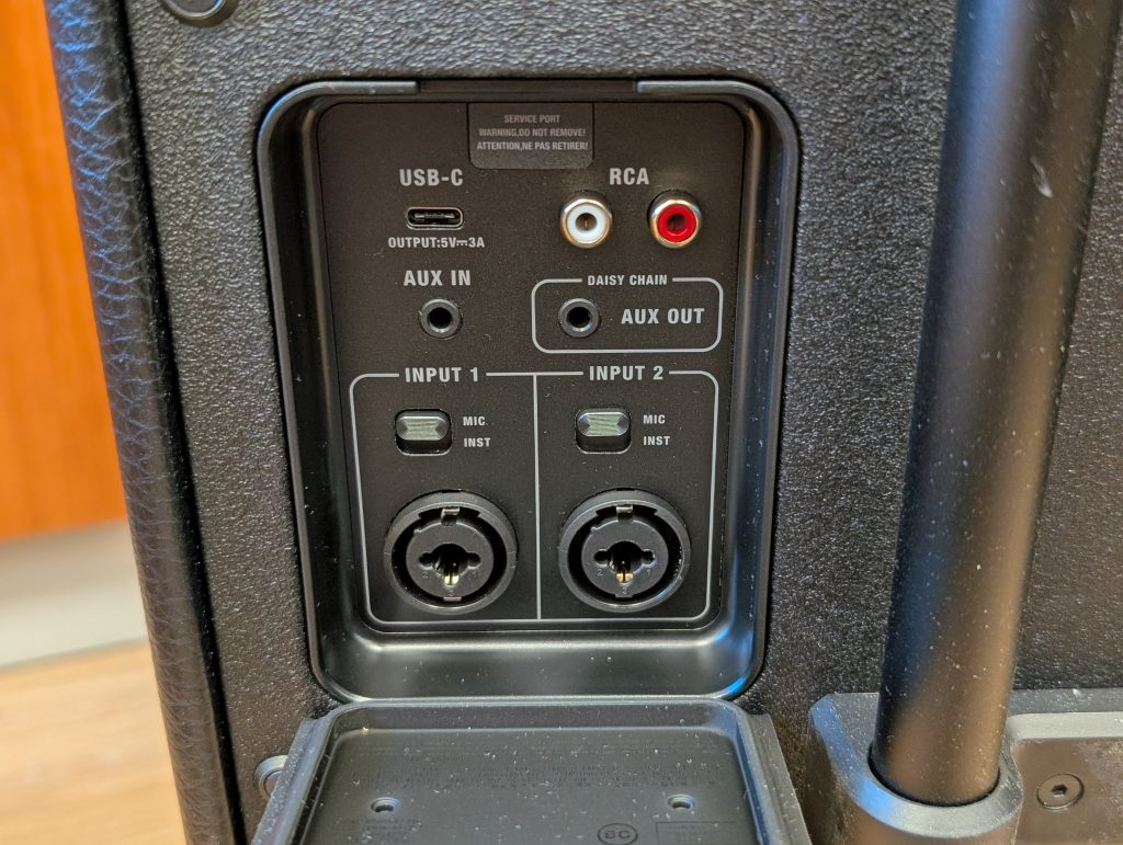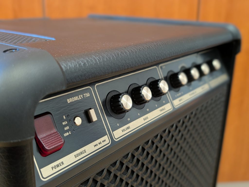 Bromley 750 je zelo vsestranski zvočnik. Poleg stabilne Bluetooth povezave ponuja širok nabor fizičnih priključkov. Na voljo so vhodi za mikrofon in instrumente, kar pomeni, da ga lahko uporabiš kot preprost ojačevalec ali karaoke sistem. Dodani so tudi RCA priključki za gramofone oziroma druge avdio naprave, pa klasični AUX in USB-C vhod za žično predvajanje.