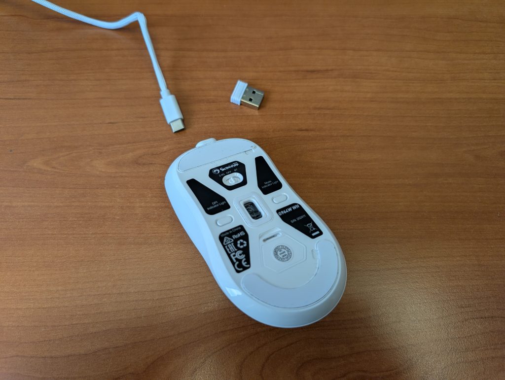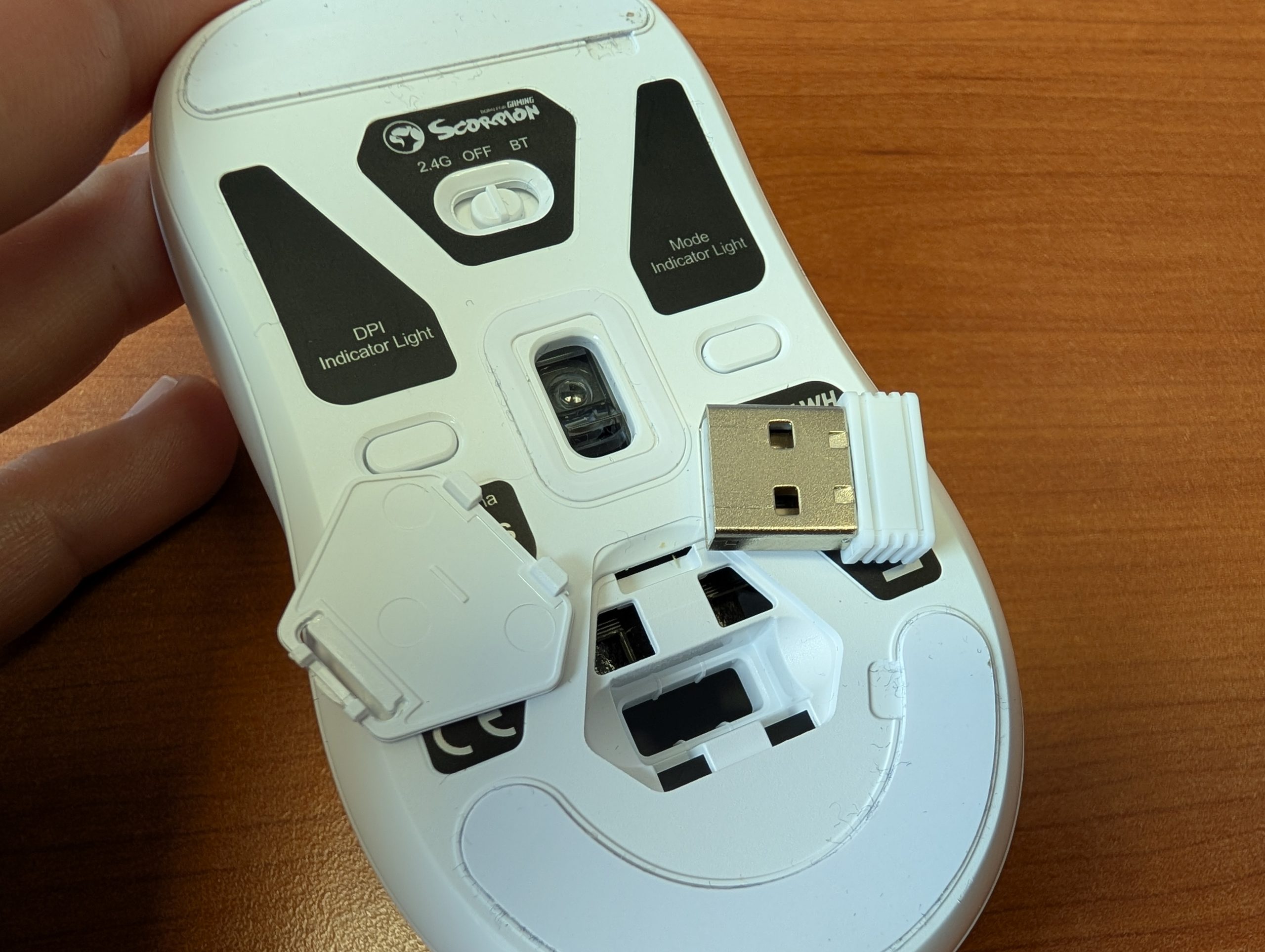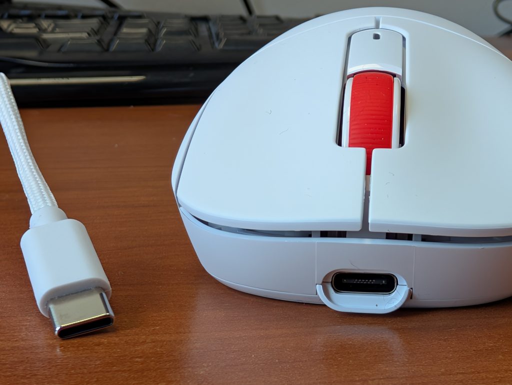 Je pa dobra stran Marvo miške tudi ta, da ima USB-C priključek za povezavo s kablom na sprednji strani, kot smo pri miškah vajeni – in če zmanjka baterije v brezžičnem načinu, ni potrebno čakati, da se baterija napolni, kot smo pri nekaterih miškah drugih proizvajalcev že videli (s priključkom na spodnjem delu miške, s čimer je med polnjenjem postala neuporabna).