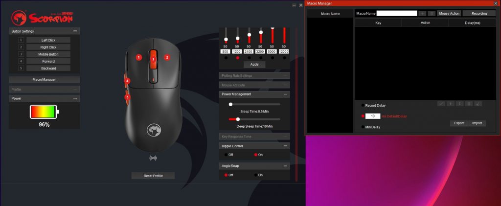 Marvova priložena programska oprema omogoča prilagoditev vseh šestih gumbov, natančno prilagajanje DPI, frekvence osveževanja in ustvarjanje makrov. Uporabniški vmesnik je preprost, a funkcionalen – dovolj za večino igralcev in produktivnih uporabnikov.