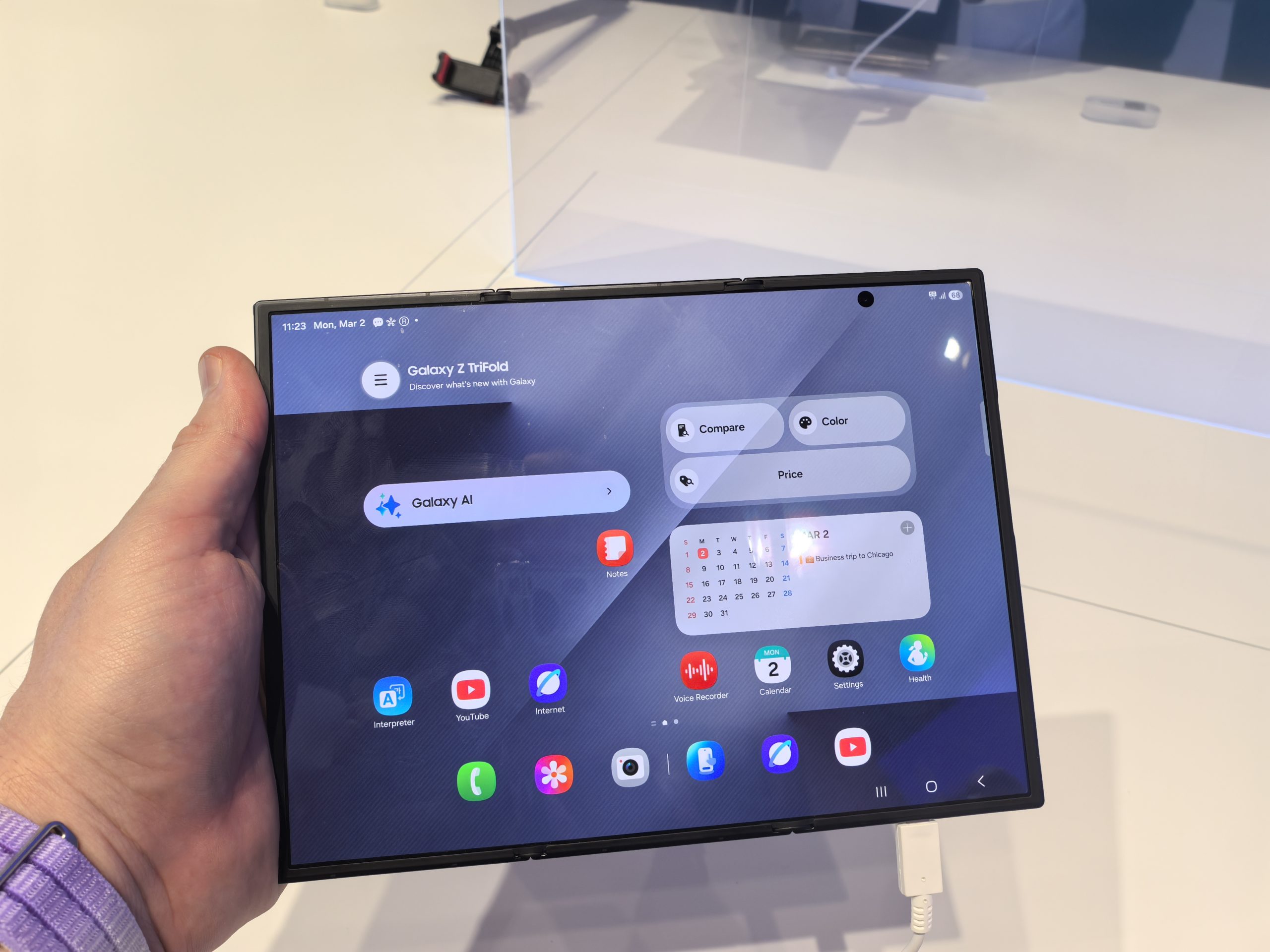 Preden najnovejše telefone dobim na test, sem na sejmišču preizkusil njihov dvojno zložljiv telefon Samsung TriFold, ki je drugi takšen primerek po Huaweievem, ki ima za seboj že kar dve generaciji. Iskreno? Je nekaj posebnega. Ideja, da imamo lahko v žepu še večji zaslon, je zelo mamljiva, še posebej za tiste, ki veliko vsebine užijemo na telefonu. Sam sem si že predstavljal, kako bi na letalu lahko na zaslonu velikosti majhne tablice gledal film ali serijo, kako bi doma iz računalnika prenašal sliko na zaslon telefona in igral najnovejše Windows igre in podobno. To se ne bo nikoli zgodilo, ker za telefon nisem pripravljen zapraviti več kot 3000 €. Vseeno pa lahko sanjam.