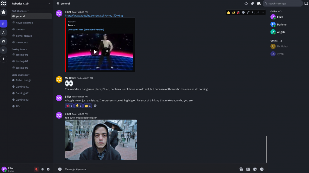 Za tiste, ki si želite izkušnjo, ki je podobna Discordu, a brez poslovne prtljage, je tukaj Revolt. Gre za odprtokodno alternativo, ki jo poganja skupnost in ne želja po čim večjem dobičku delničarjev. Revolt je preprost, ampak hkrati si lahko z njim daš duška. Sami ali s pomočjo skupnosti lahko ustvarite lastne teme in dodatke. Namestitev je hitra, na voljo pa je tudi odlična spletna različica, ki deluje brezhibno. Slabost? Še vedno je v fazi razvoja. Včasih naletite na kakšnega hrošča ali pa ugotovite, da kakšna napredna funkcija, kot je deljenje zaslona z določenimi nastavitvami zvoka, še ne deluje povsem tako, kot bi morala. A obstaja nekakšen čar v tem, da podpirate projekt, ki nastaja iz strasti in ne iz pohlepa.