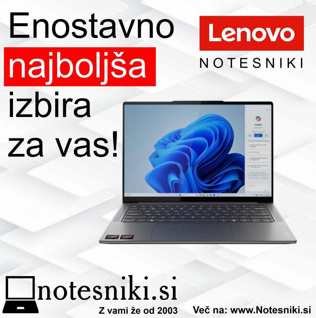 Za šefe v podjetju, ki želijo še več prenosnika in še boljše materiale ter svojega spremljevalca odnesejo tudi na kak sestanek, pa bo prava izbira zveneče kodno ime Yoga. Pri prenosnih računalnikh Yoga se pa uporabljajo še boljši materiali od aluminija in magnezija in tam ohišja niso čisto nič plastična. Najnovejša Yoga 14AKP10 se pohvali s procesorjem AMD Ryzen AI 7, ki ima strojno podporo za operacije umetne inteligence in vgrajenega kar 32 GB spomina in 1 TB diska. Da je notesnik malo manjši in lažji nam pove tudi podatek, da je zgrajen okoli 14,5″ led LCD zaslona, ki pa ima nadstandardno resolucijo 3K. Seveda ima tudi ta lepotec serijsko 12 mesecev garancije in naložen Microsoft Windows operacijski sistem. Prenosnik je za promocijsko ceno 1299 EUR z DDV na voljo tukaj,