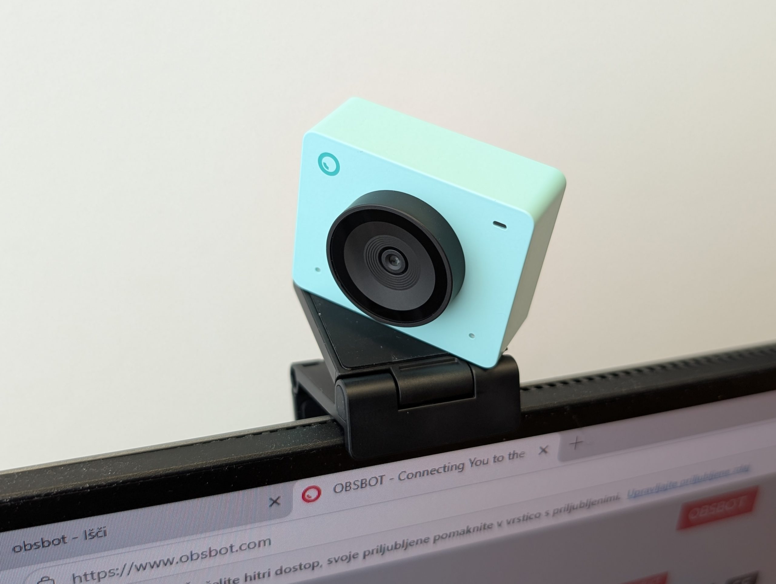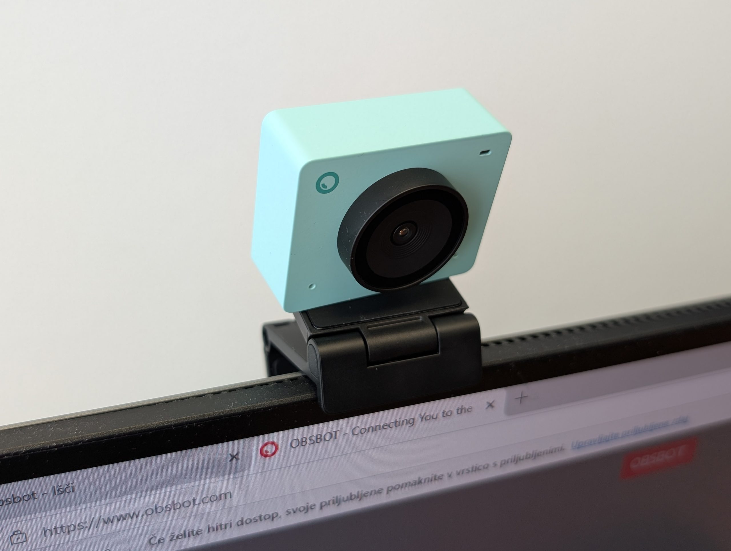 Pohvalno je, da OBSBOT priloži magnetni pokrovček za lečo, ki skrbi za zasebnost, ter stabilen nosilec, ki se dobro oprime monitorja. Kamera se povezuje prek kabla USB-C, za starejše računalnike je priložen tudi adapter na USB-A. Namestitev je povsem preprosta: priključiš in kamera deluje.