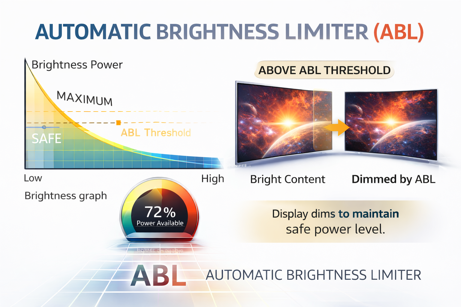 Prva tema, ki jo je treba razumeti, je ABL, torej samodejno omejevanje svetilnosti. To je mehanizem, s katerim OLED upravlja porabo in toploto pri velikih svetlih površinah. V praksi to pomeni zelo preprost prizor: zvečer, ko gledaš film s temnim ozadjem in nekaj zelo svetlimi poudarki, zna OLED delovati osupljivo. Dopoldne, ko odpreš velik bel Excel, Word, brskalnik in e-pošto čez skoraj cel zaslon, pa se lahko svetilnost obnaša drugače kot pri LCD-ju. Zaslon ni slabši, le drugače upravlja energijo.