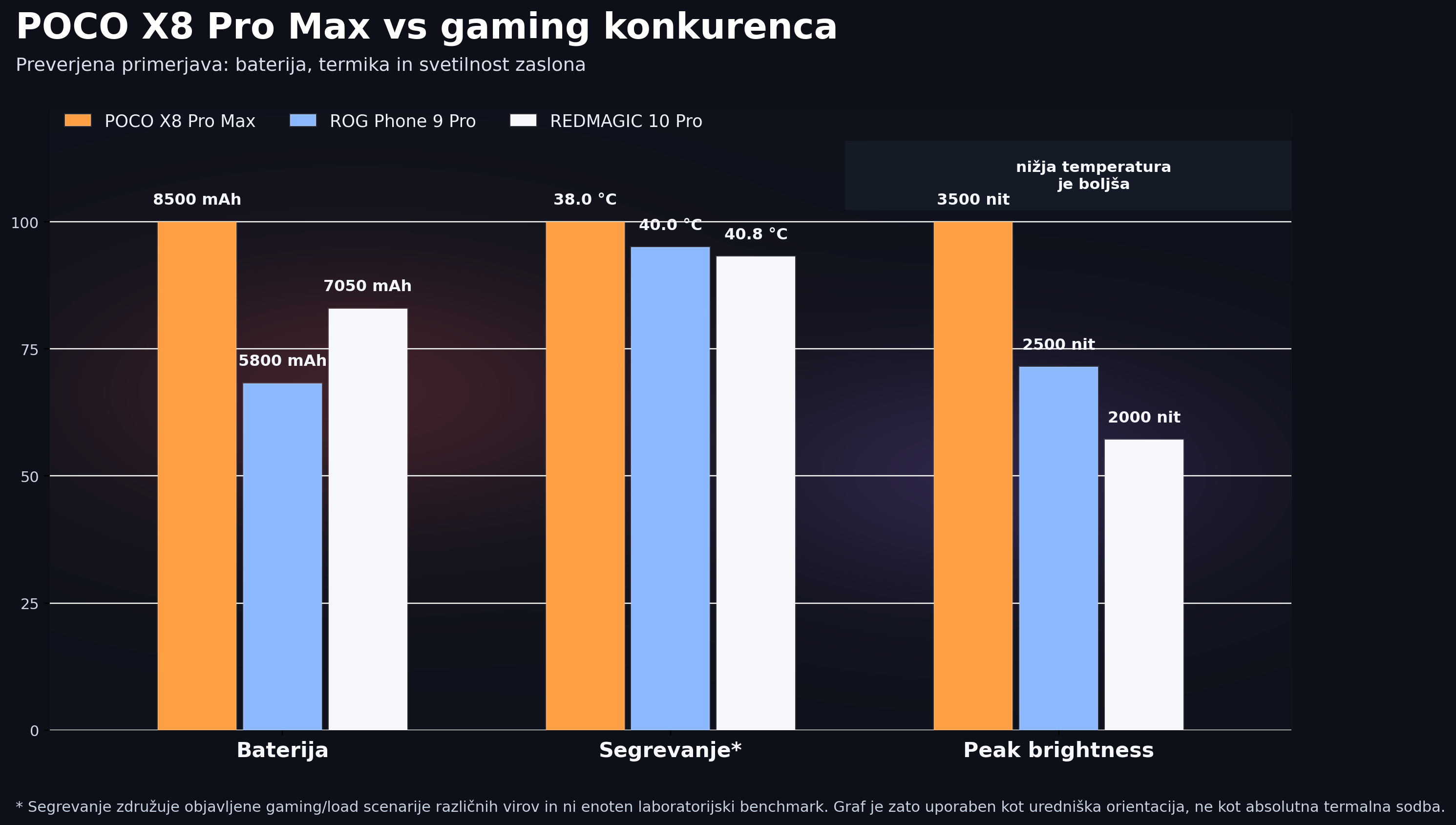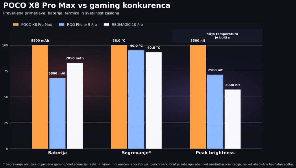 In najboljše pri vsem skupaj je, da to ni samo dober seznam specifikacij. X8 Pro Max v gaming testih ne deluje kot še en “benchmark junak”, ki blesti pet minut, potem pa začne sopsti. V 91mobiles gaming testu je v BGMI in Call of Duty: Mobile pokazal prav tisto, kar gamerji dejansko cenijo: stabilen fps, dobro termiko in presenetljivo mirno delovanje tudi pri daljši obremenitvi. V BGMI je pri najvišjih relevantnih nastavitvah držal skoraj 40 fps povprečja z zelo skromnim dvigom temperature, pri COD: Mobile pa je bil po njihovem testu celo hladnejši od iQOO 15R. To pomeni nekaj zelo pomembnega: POCO tu ne prodaja samo hitrosti, ampak tudi kontrolo. In pri gamingu je to pogosto razlika med “močan telefon” in “res dober gaming telefon”.