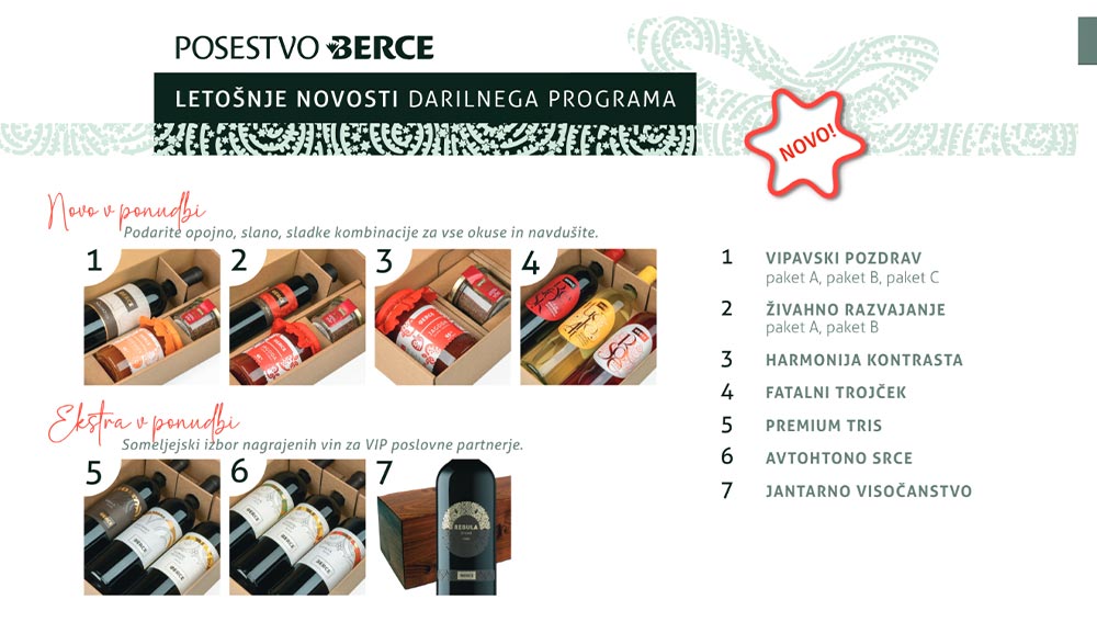 Vsaka steklenica vina Berce nosi svojo zgodbo. Je rezultat zemlje, sonca, vode in človeka. Zato na Posestvu Berce ponujajo tudi izjemno kolekcijo darilnih paketov, ki združujejo njihova nagrajena vina ter domače dobrote, kot so zdravi sadni namazi in kisi iz naravnih sestavin.