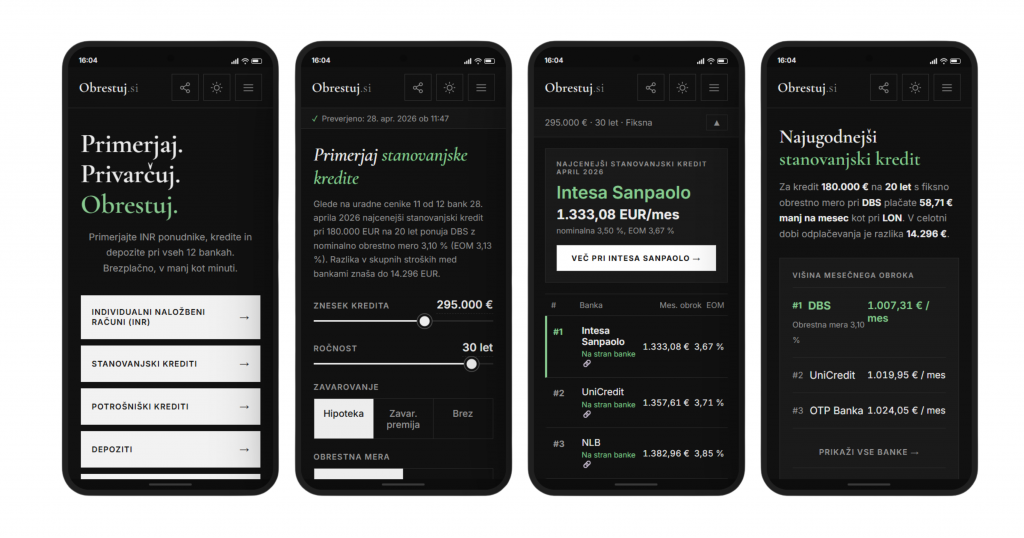 Platforma Obrestuj.si je postala prva slovenska rešitev, ki na enem mestu združuje žive primerjave stanovanjskih in potrošniških kreditov, depozitov ter individualnih naložbenih računov (INR). Gre za neodvisno platformo, ki temelji izključno na uradnih cenikih bank in ponudnikov, brez lastniških povezav z bankami, ki jih primerja. Uporabniki tako dobijo dostop do primerjave vseh slovenskih bank hkrati, brez iskanja po posameznih spletnih straneh, plačljivih primerjavah z omejenim naborom ali zastarelih forumih.