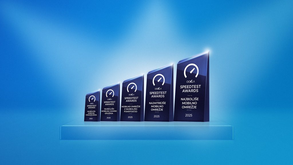 *Nagrade za najboljše mobilno omrežje, najhitrejše mobilno omrežje, mobilno omrežje z najboljšo pokritostjo, omrežje z najboljšo mobilno gaming izkušnjo in omrežje z najboljšo mobilno videoizkušnjo v Sloveniji 2025 temeljijo na analizi podatkov storitve Ookla® Speedtest Intelligence® za obdobje prvega polletja 2025. Velikost vzorca: 1.210.882 testnih meritev in 25.293.490 pregledov pokritosti. Obdobje izvedbe: od 1. januarja 2025 do 30. junija 2025. Blagovna znamka Ookla® je uporabljena po licenci in z dovoljenjem.