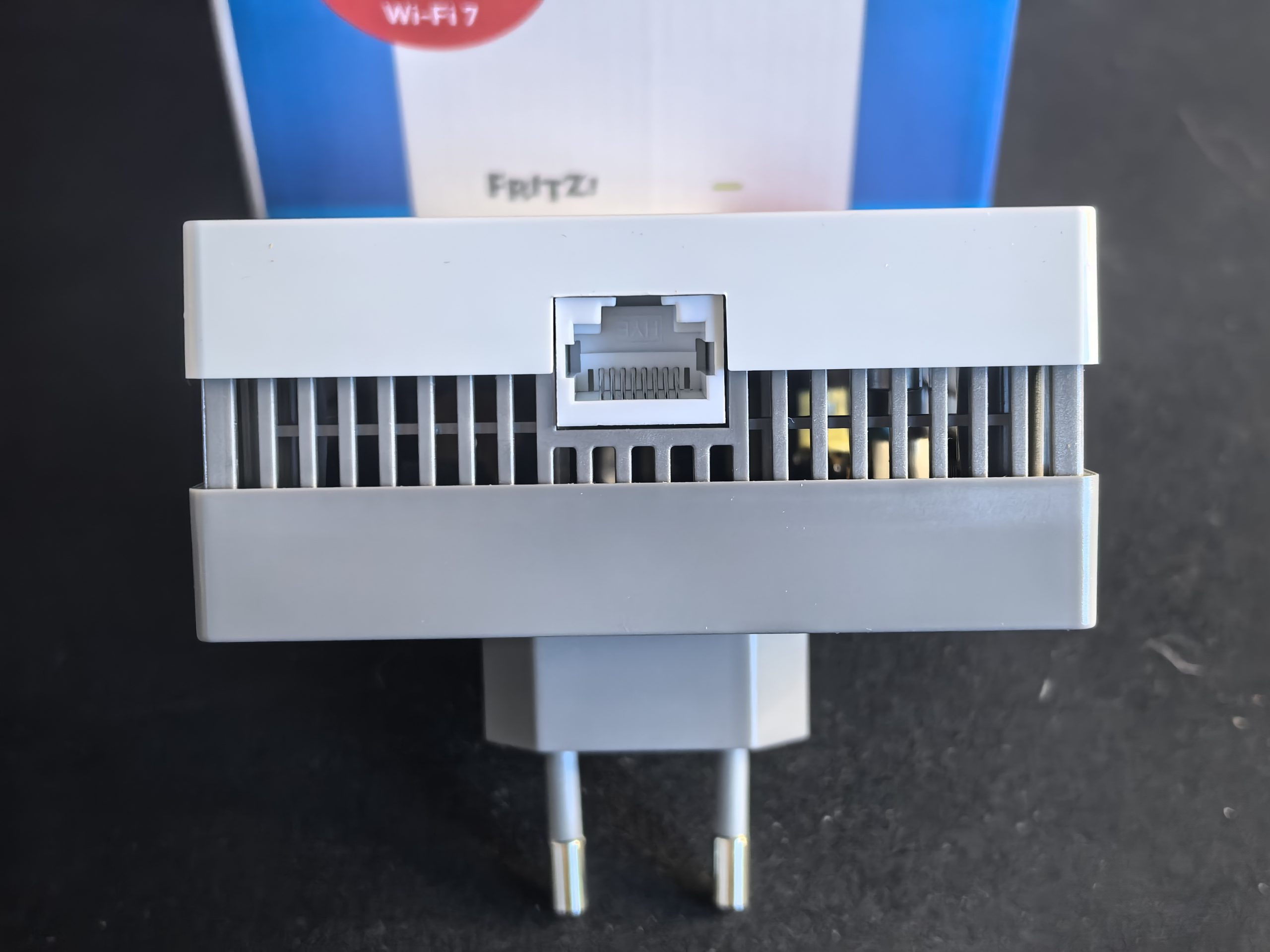 Na dnu naprave se skriva en gigabitni LAN priključek. Ta je ključen za dva scenarija: ali želite nanj s kablom povezati napravo, ki nima Wi-Fi modula (na primer starejšo igralno konzolo ali pametni TV), ali pa želite ojačevalnik s hišnim usmerjevalnikom povezati preko LAN kabla (način LAN Bridge), kar zagotavlja maksimalne hitrosti brez izgub zaradi razdalje. Ko ga priklopiš ob FRITZ!Box 5690 Pro, se nastavitev zgodi praktično sama. En klik na WPS in repetitor prevzame vse nastavitve omrežja. SSID ostane enak, geslo prav tako. To je prednost, če kupuješ znotraj istega ekosistema.