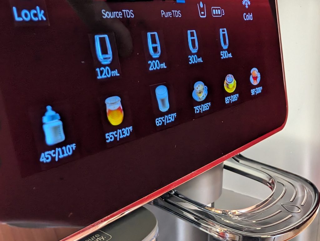 Poleg temperature lahko nastaviš tudi količino vode, ki jo naprava natoči. Na voljo so prednastavljeni mililitri – 120, 200, 300 in 500 – kar se izkaže za zelo praktično pri pripravi napitkov ali pri kuhanju. Natančno doziranje pomeni, da lahko vodo odmeriš brez dodatnih merilnih posod, kar se mi zdi super.