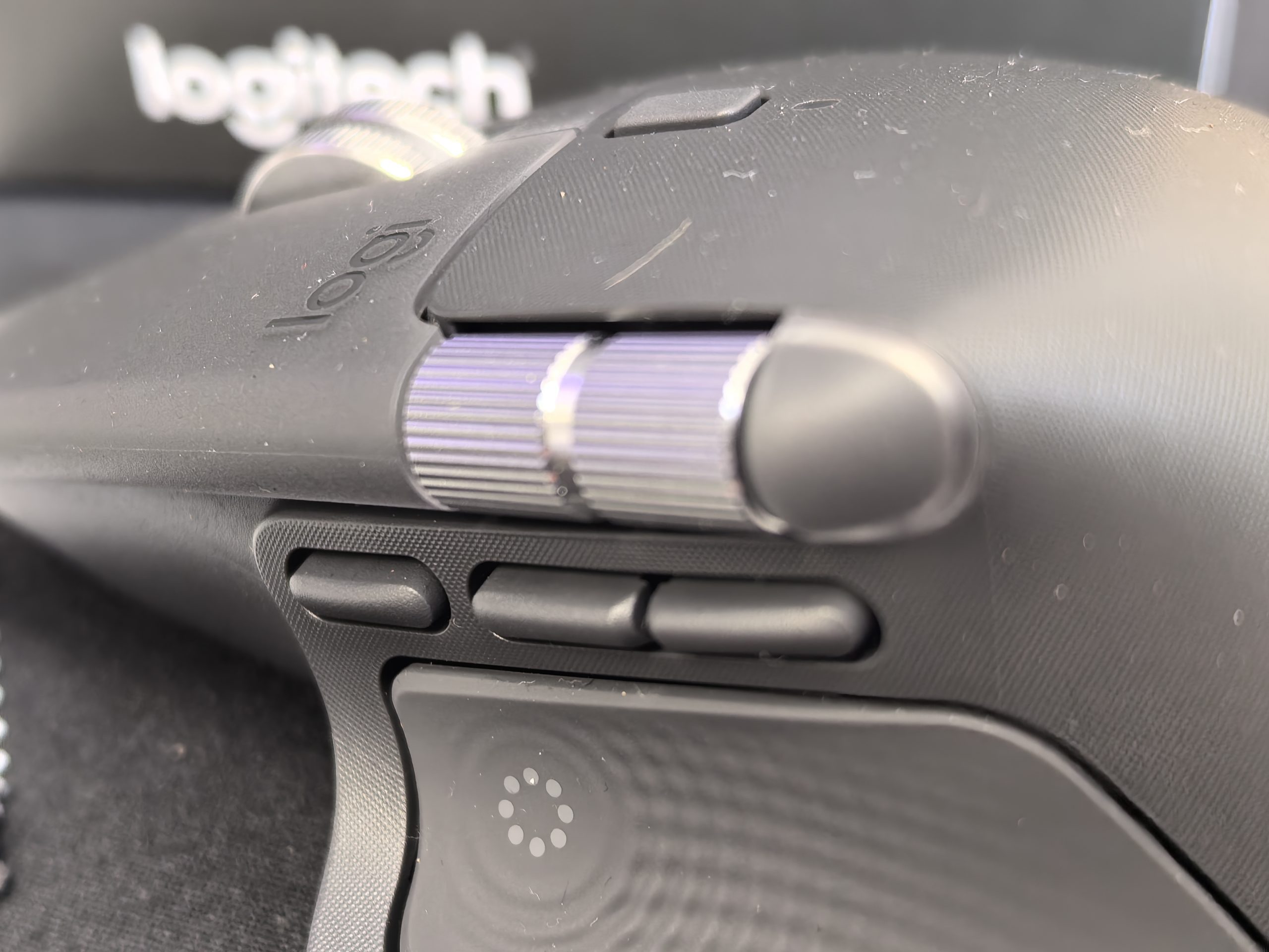 Miška Logitech MX Master 4 ima skupno 8 gumbov. Poleg standardnih levega in desnega klika ter klika sredinskega koleščka najdemo tik pod glavnim koleščkom manjši gumb, ki služi za ročno preklapljanje načina vrtenja. Na levem boku so tri stranske tipke: dve sta klasični tipki Naprej/Nazaj (pogosto v brskalnikih in drugih orodjih za navigacijo), tretja, nekoliko manjša spredaj, pa privzeto na macOS-u služi hitremu preklopu med namizji, na Windows računalnikih ji lahko dodelimo drugo funkcijo (znotraj aplikacije).