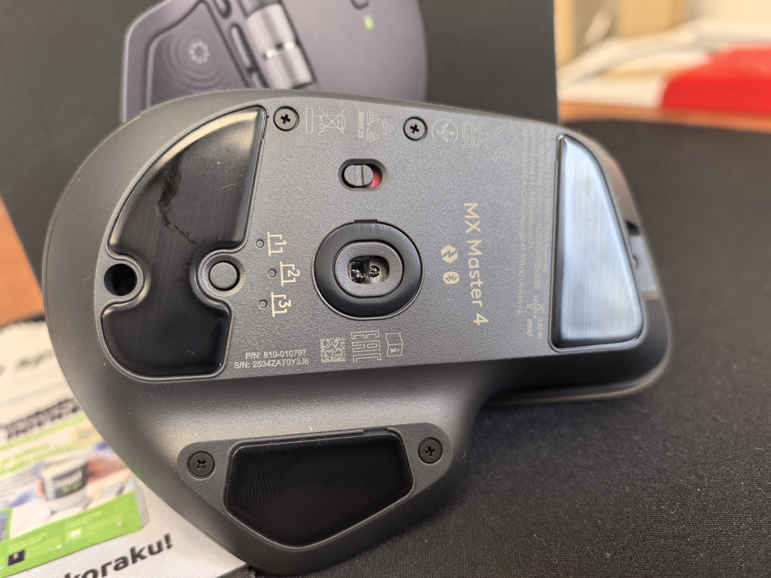 Ena ključnih prednosti serije Master je povezljivost z več napravami. MX Master 4 lahko hkrati povežemo z do tremi napravami (preko poljubne kombinacije BT/Bolt), med katerimi preklapljamo s pritiskom na gumb na spodnji strani miške (označen z 1, 2, 3) ali prek funkcije v programski opremi. Logitech je to funkcijo imenoval Easy-Switch in omogoča, da z eno miško upravljate na primer prenosnik, namizni računalnik in tablico, brez ponovne seznanitve. Indikatorska LED lučka ob preklopu pokaže, katera številka naprave je aktivna. Preklapljanje je hitro (v sekundi ali dveh) in zelo priročno, če uporabljate več naprav hkrati.