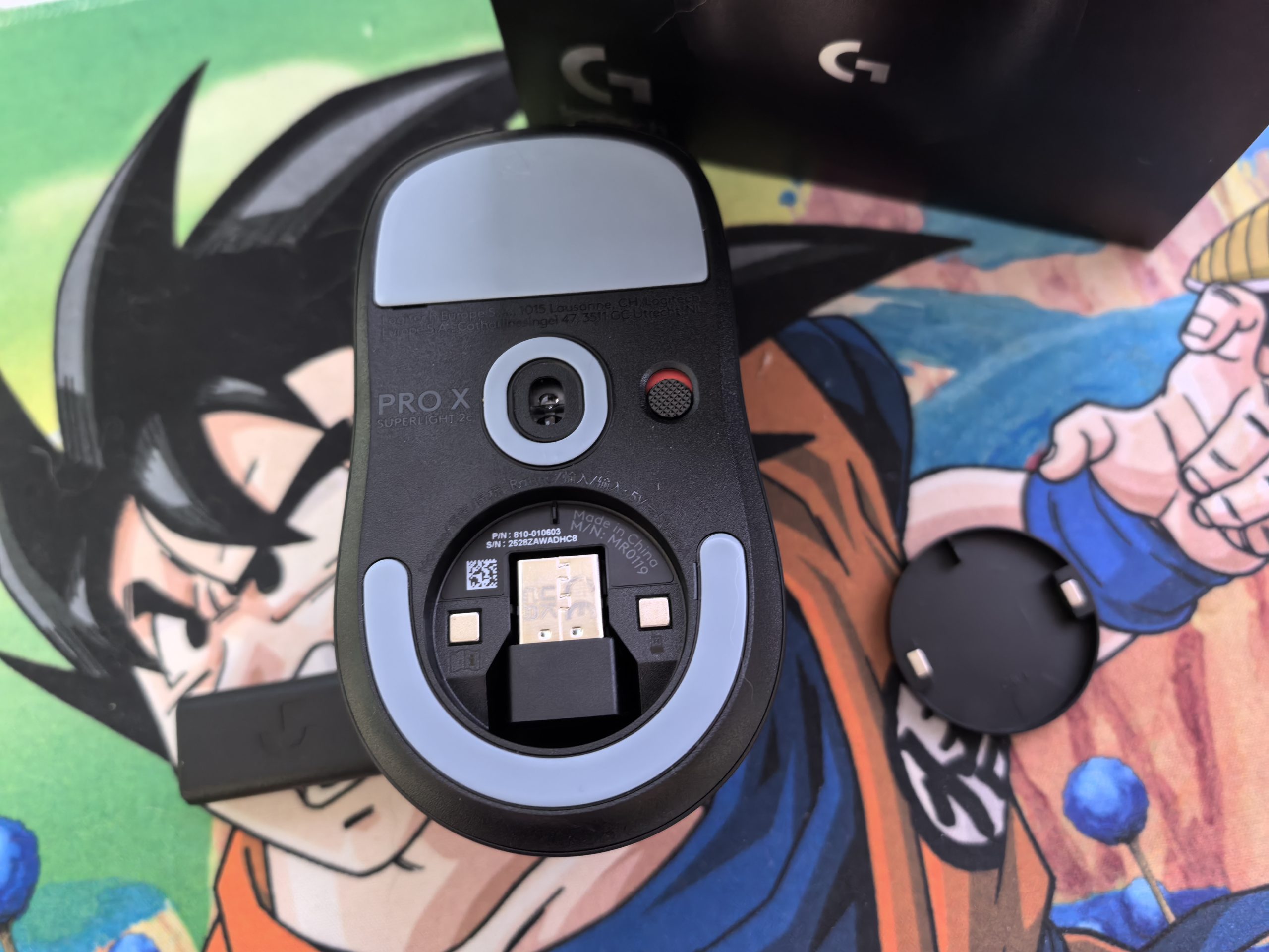 Spredaj je odprtina za USB-C (za polnjenje), v embalaži dobiš priložen gumiran polnilni kabel (okoli 1,9 m), Lightspeed adapter za brezžično povezavo, nalepke za boljši oprijem in dodatni PTFE pokrovček za odprtino na dnu miške, kjer lahko hraniš omenjeni adapter. Pazi, da ne izgubiš kabla, kajti samo z originalnim lahko opraviš morebitne posodobitve programske opreme.