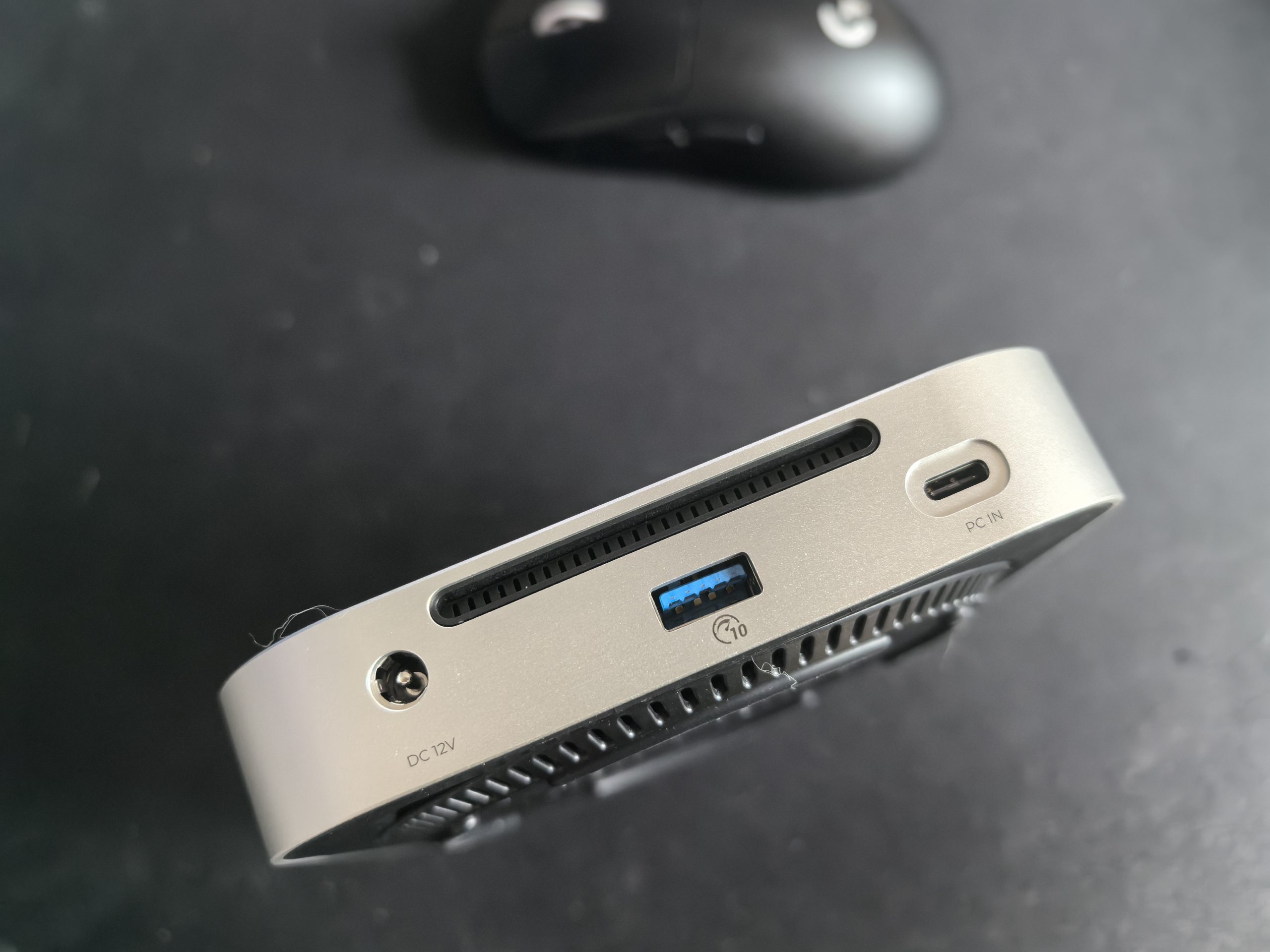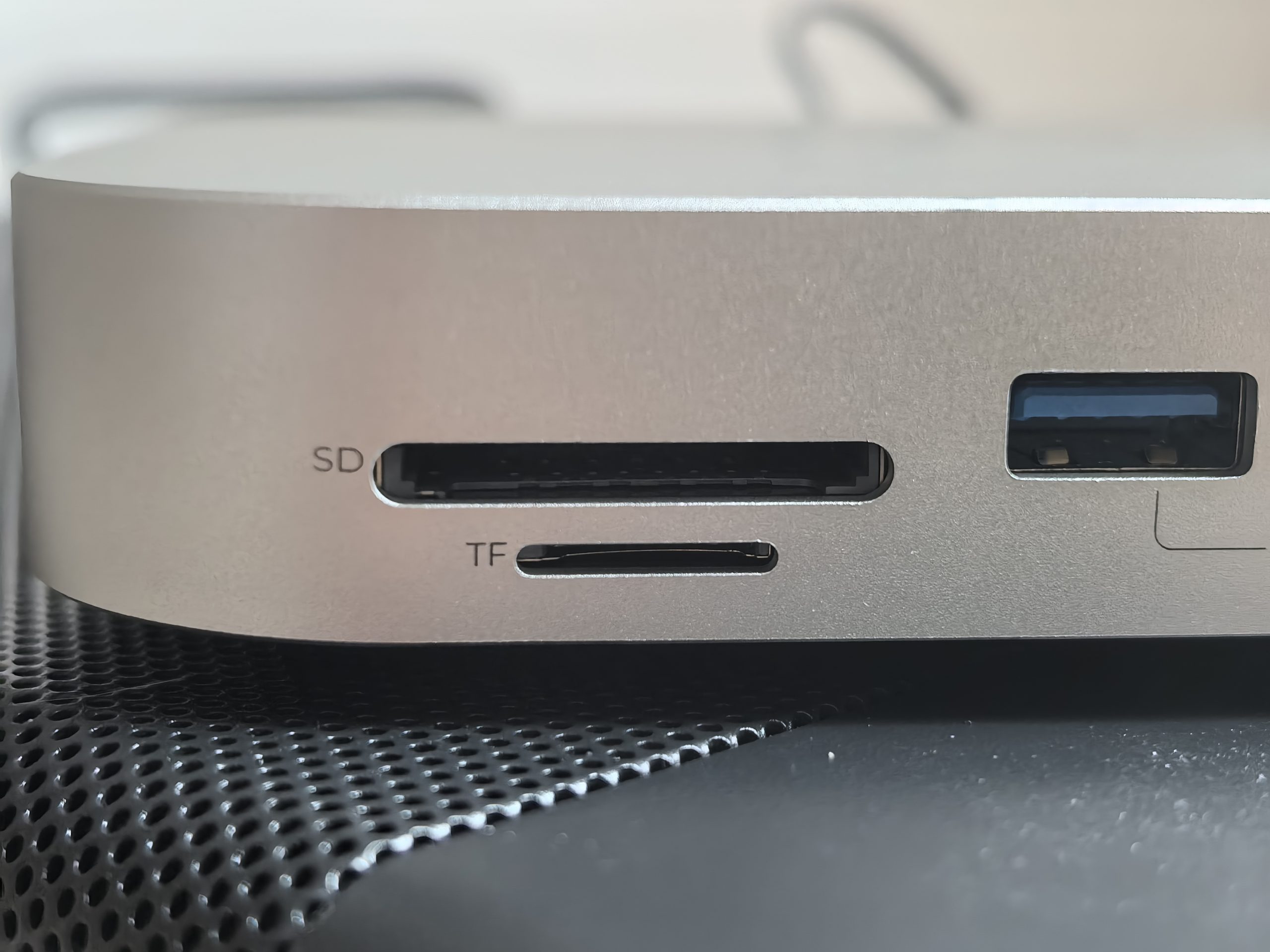 Ohišje je izredno majhno in kompaktno. Opazi se, da je naprava narejena, da bi sedela na računalniku Mac mini. Zato tudi izbor aluminijeve zlitine (spodnji del iz plastike), ki učinkovito odvaja toploto. Spredaj imaš dva USB 3.2 priključka in reži za branje SD in TF kartic (standard 4.0). Zadaj je dodaten USB 3.2 in pa priključek za napajanje ter USB-C za povezovanje z računalnikom in drugimi napravami. Zadaj in spodaj so reže za odvajanje toplote, vgrajen je pa tudi ventilator.