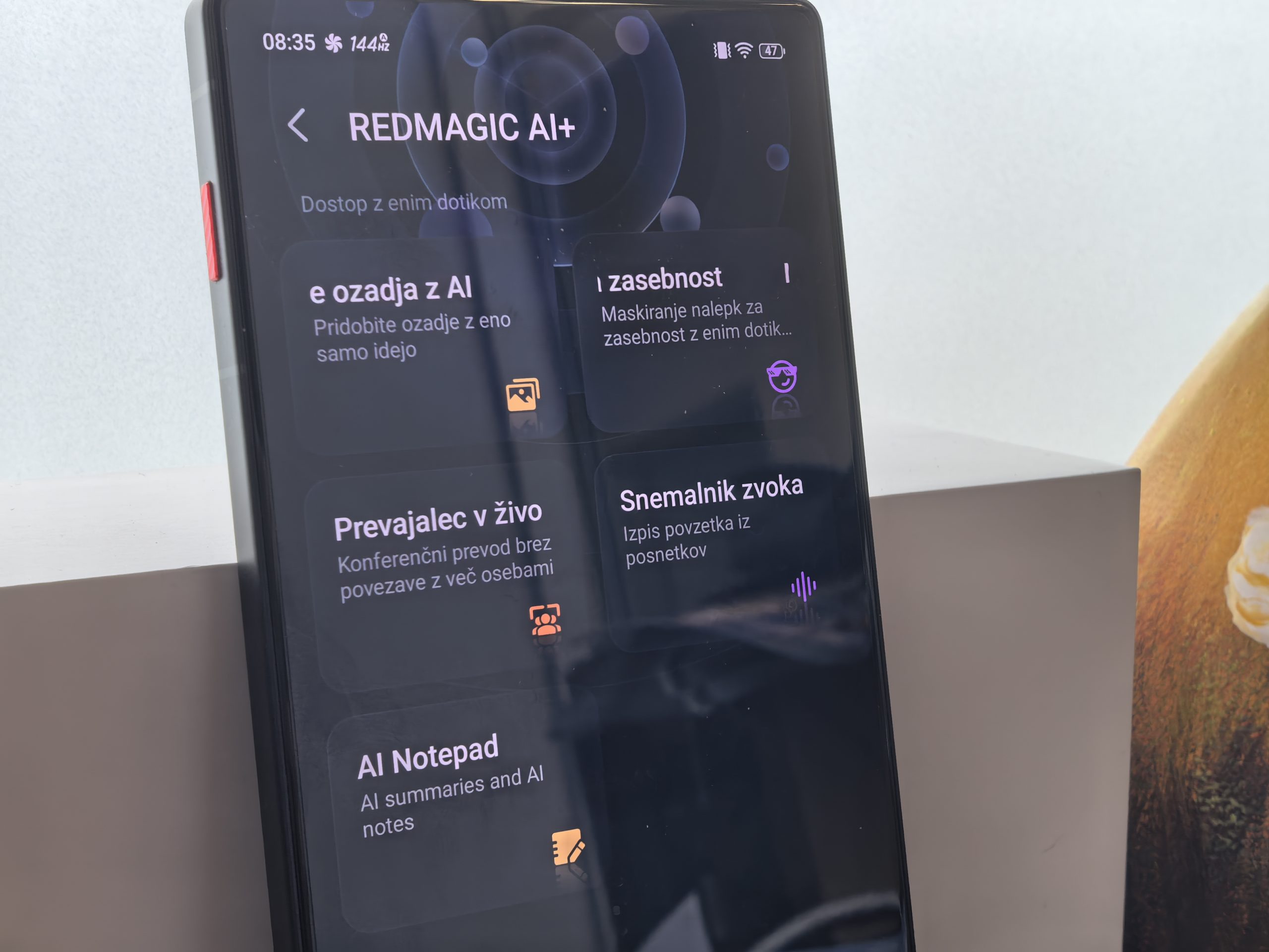 Poleg že omenjenega UI orodja ima RedMagic OS še nekaj podobnih. Umetna inteligenca ti lahko pomaga pri pisanju in urejanju besedil, na primer znotraj Gmaila, Messengerja. Za določene jezike (slovenščina ni med njimi) lahko uporabiš prevajanje v živo, podnapise v živo (med klicem), transkripcijo zvoka v besedilo in podobno. UI portfelj je soliden, uporabiš lahko tudi integriran Gemini in Gemini Live. Edino, kar res pogrešam, je Iskanje z obkroževanjem. Ko na primer najdeš nekaj na spletu ali v posnetku, je priročno in hitro, da lahko to stvar samo obkrožiš in Gemini ti postreže najbolj relevantne rezultate.