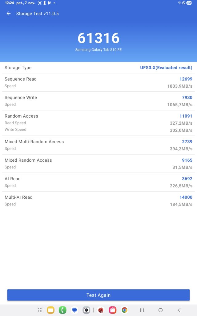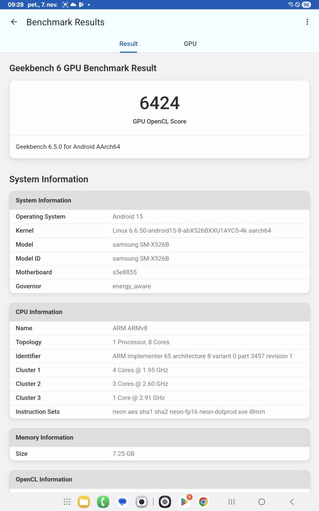 Vsi testi so jasno pokazali, da se Samsungov čip Exynos 1580 ne more primerjati z rivali od Snapdragona in MediaTeka v istem cenovnem rangu. Drugje v seriji Galaxy Tab S10 so uporabili MediaTekov čip 9300+, ki bo bolj po godu tistim, ki nameravate tablico uporabljati za bolj intenzivna opravila ali igranje iger. Tudi pri RAM-u in pogonu so skoparili. Na voljo ga je 8 GB, obstajajo sicer različice z 12 GB RAM-a, vendar sem prečesal naše trgovine in pri nobeni je nisem uspel najti. Privzeto je na voljo 128 GB prostora za hrambo datotek. Če odšteješ prostor, ki ga potrebuje sistem, ti ostane okoli 100 GB, kar bi napolnil v nekaj urah, če bi to res želel. Mislim, da je čas, da se poslovimo od te kapacitete in postavimo 256 GB kot standard.