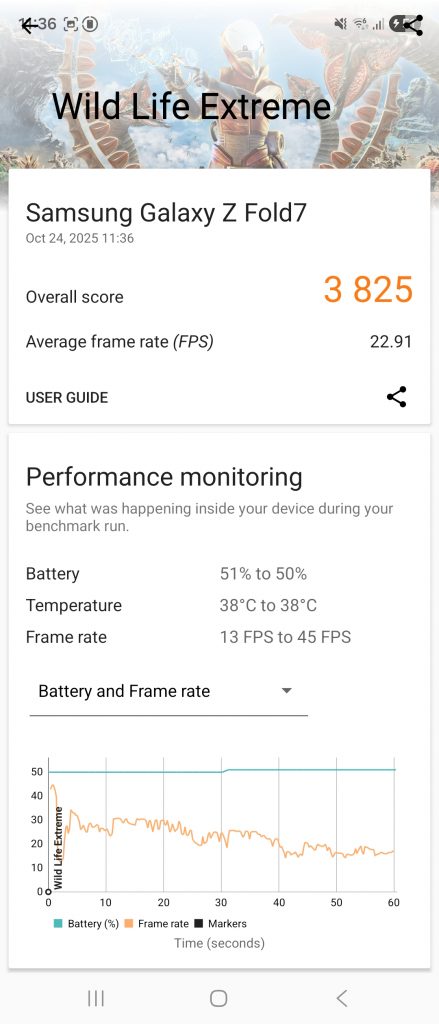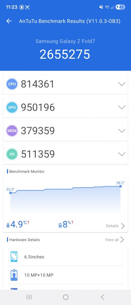 Ostale komponente so v redu. Dobimo do 16 GB RAM-a, hitri UFS 4.0 pogon kapacitete do 1 TB. Baterija ima podpovprečno kapaciteto 4400 mAh, zato je tudi avtonomija zgolj povprečna. Lahko bi bila še slabša, če ne bi bil One UI med bolje optimiziranimi sistemi. Že nekaj časa vsi pravimo, da se mora Samsung zmigati pri tehnologiji baterij, predstaviti višje kapacitete, ubrati nove materiale in povečati hitrost polnjenja. Prav slednja je zame največja rak rana Samsung telefonov. Huawei Pura 80 Ultra, ki sem jo uporabljal vzporedno s Foldom, prav tako nima rekordne baterije, ampak jo lahko napolnim v 10 minutah. Tudi pri Samsungu me ne bi motilo, da nekaj ur zaostaja za rekorderji, če bi se njihova naprava napolnila tako hitro. Vem, da obstajajo pomisleki, kako hitro polnjenje vpliva na baterijo. Prej sem imel Huawei Mate 50 Pro (okoli dve leti) in po ne vem koliko ciklih je bilo zdravje baterije še vedno 96 %.