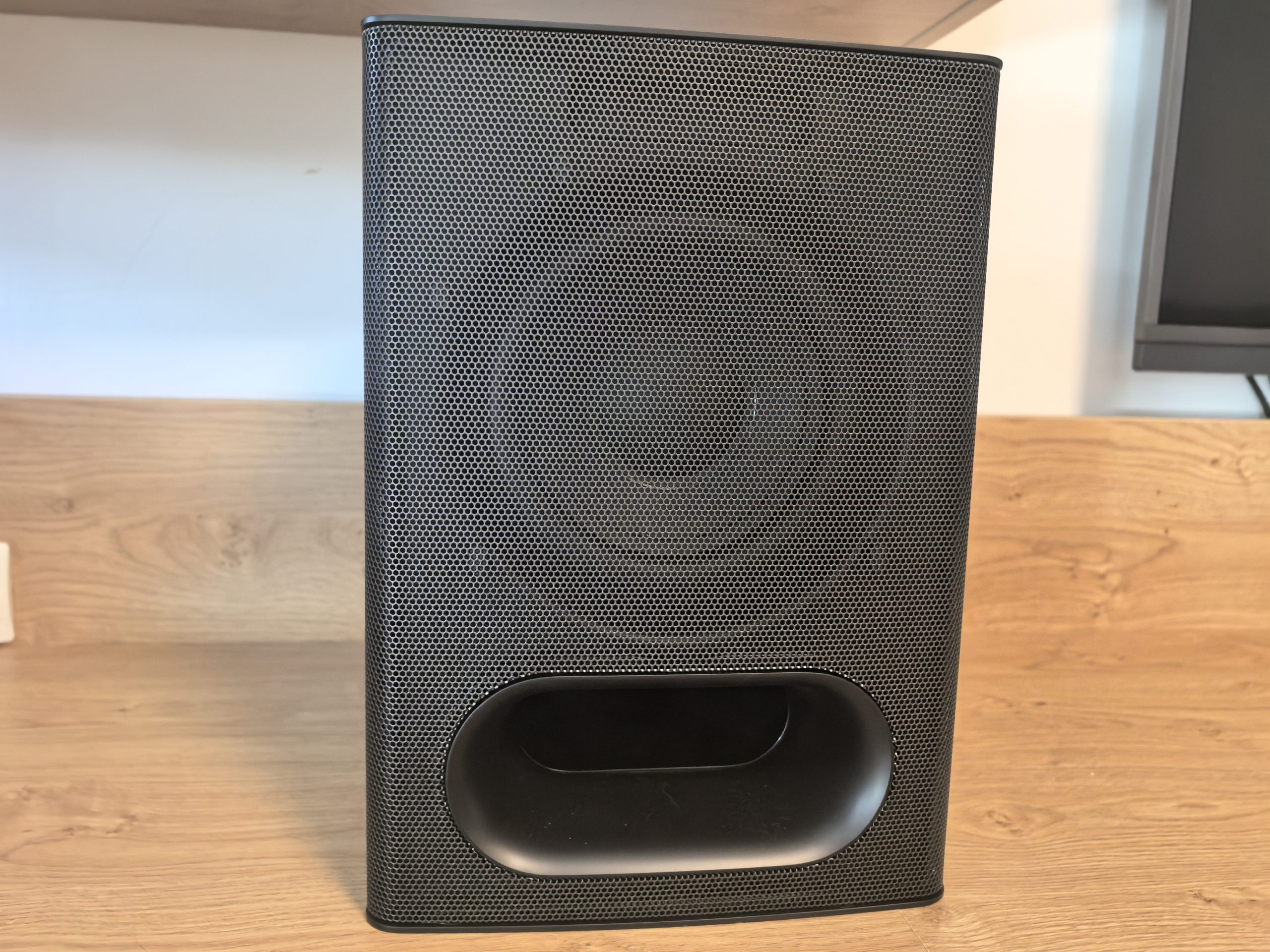 Zvočna letev je razmeroma tanka. Če imate televizor na nogicah (jaz ga imam na steni, zato s postavitvijo nimam težav), ne bi smeli imeti težav z umestitvijo letve. Oblika je povsem običajna, niso se odločili za osvetljavo ali manjši zaslon. Nizkotonec je zajeten in tudi težak, zato glejte, da boste zanj imeli dovolj prostora. Na zadnji strani je vhod HDMI eARC, optični priključek, priključek za napajanje in terminal za povezovanje zvočne letve. Če bi želel dlakocepiti, bi lahko dodali še dodaten HDMI, če bi uporabnik hotel nizkotonec uporabiti kot vozlišče za vse morebitne zvočne vire. Na voljo je tudi Bluetooth (5.3), ni pa AirPlaya ali podobno. Mene osebno to ne moti. Včasih mi je všeč, da je naprava »neumna«.