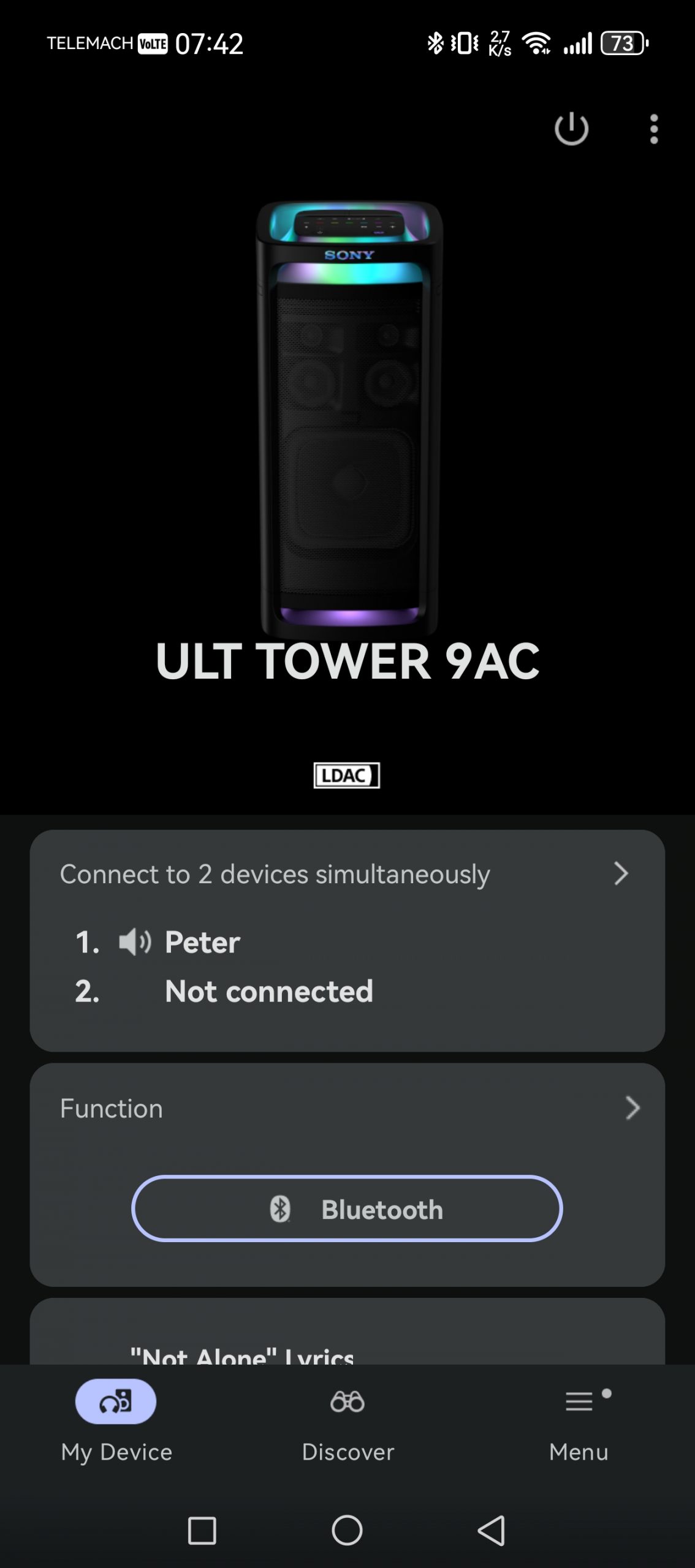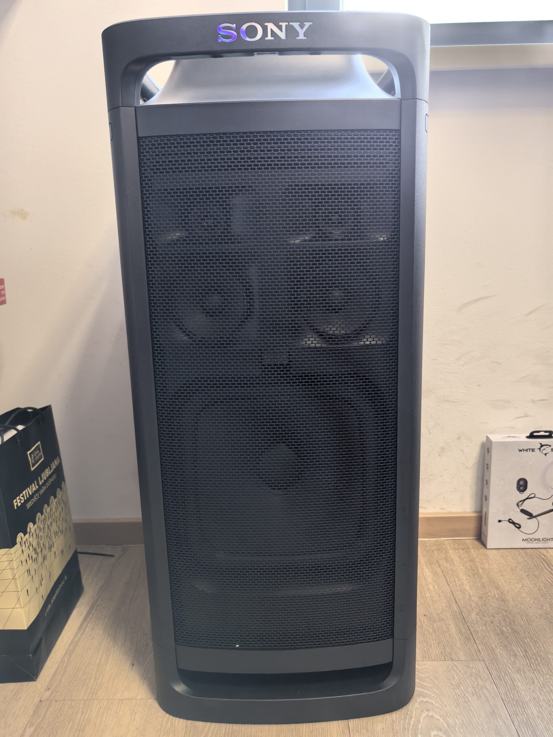 Sony ULT 9AC me je v trenutku impresioniral s svojo surovo močjo. V notranjosti te skoraj meter visoke avdio zverine se skriva kar sedem zvočniških enot: ogromen nizkotonec približno 30 cm premera (pravokotne oblike, kar Sony imenuje X-Balanced za manj popačenj), dva srednjetonca in štirje visokotonci (dva usmerjena naprej, dva nazaj). Ta 3-sistemska zasnova pomeni, da lahko zvočnik predvaja glasbo zelo glasno, ne da bi pri tem žrtvoval jasnost posameznih frekvenc. Že pri 50-% glasnosti se je v mojem prostoru slišalo, kot da imam na obisku cel bend. Bobni so zadoneli, bas kitara je mrmrala globoko in čutno, vokali pa so še vedno prodirali skozi zvočno kuliso.